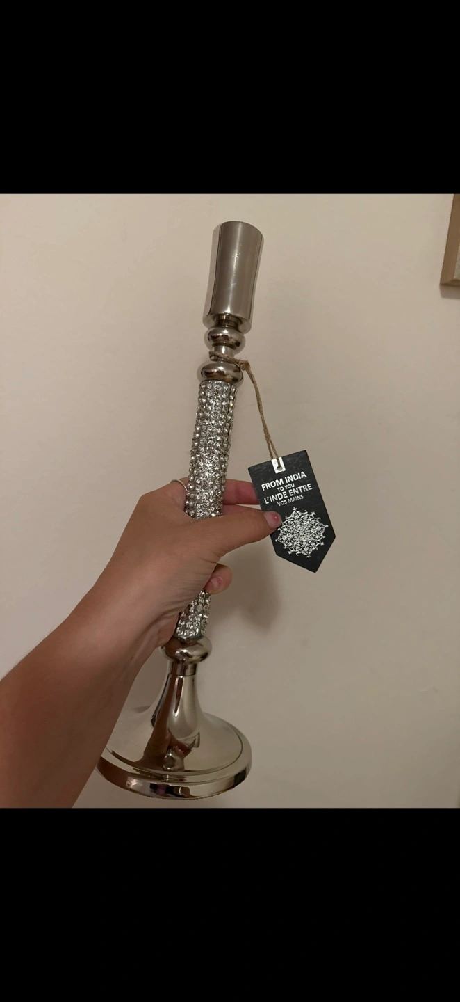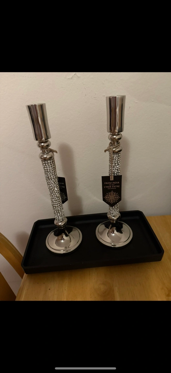Selling a pair of candlestick holders from From India L'inde Entre. They have a silver finish with a decorative rhinestone accent on the stem. They are in great condition and would add a touch of elegance to any room