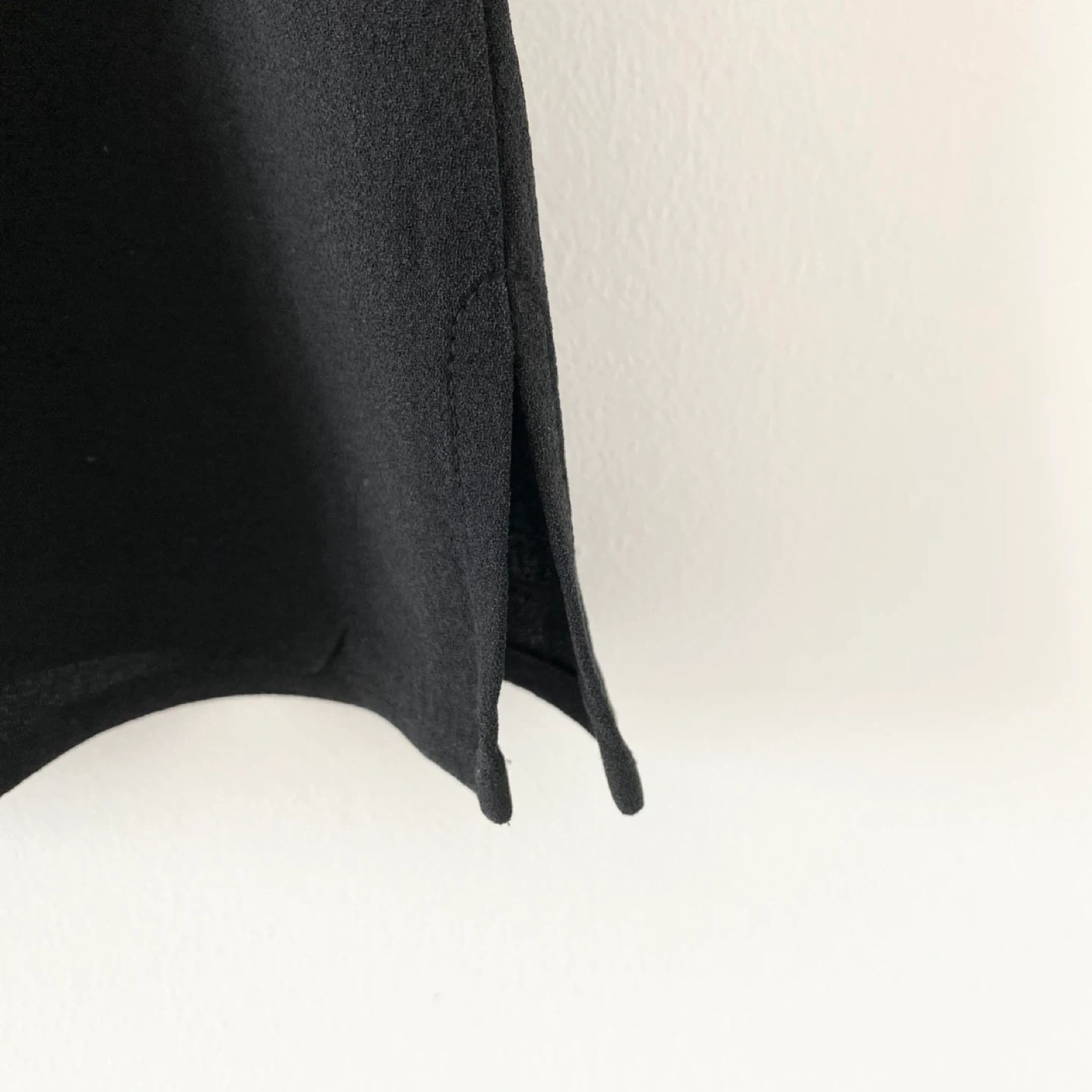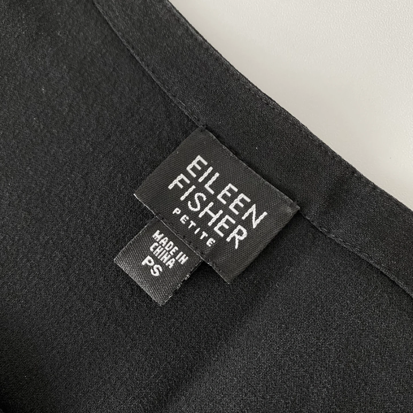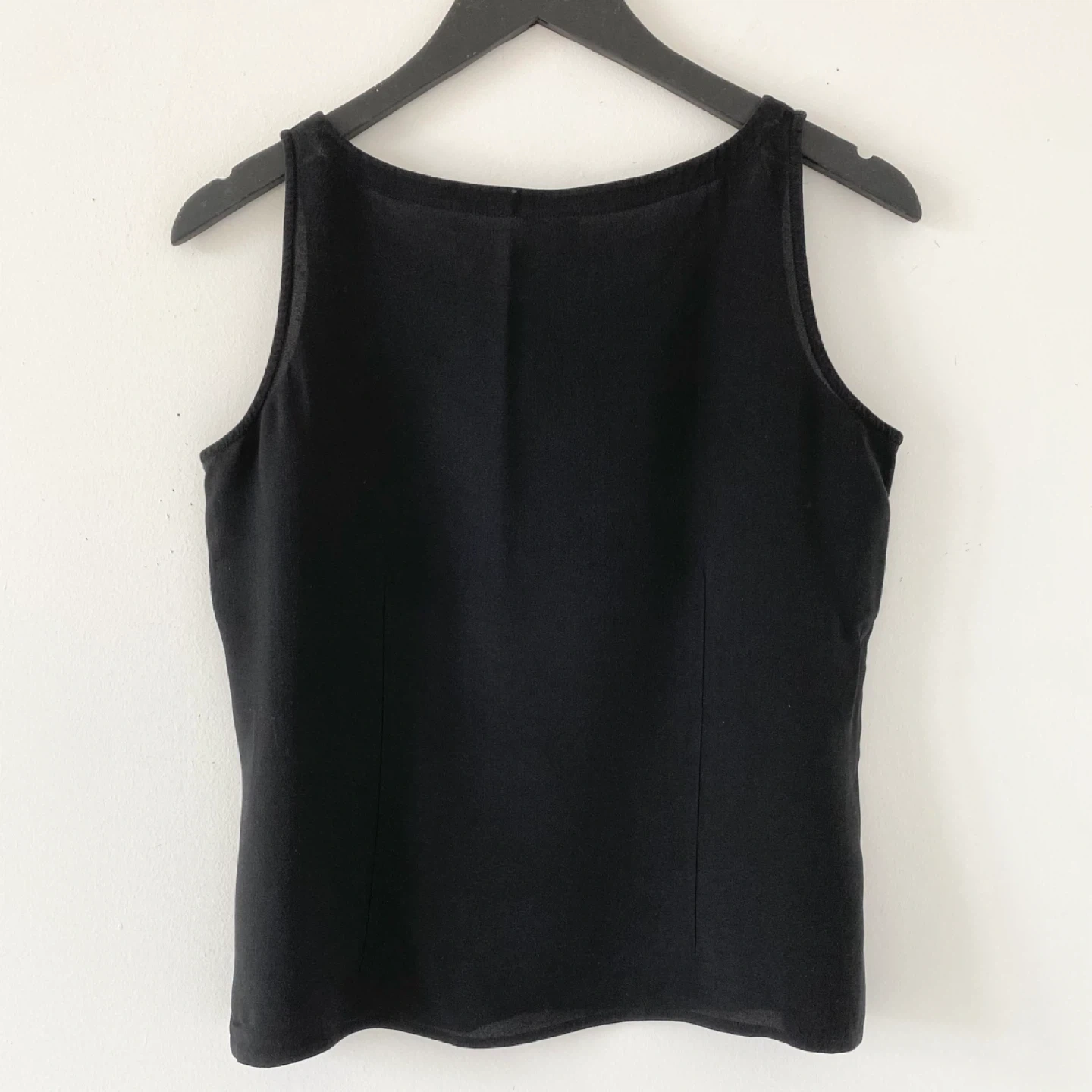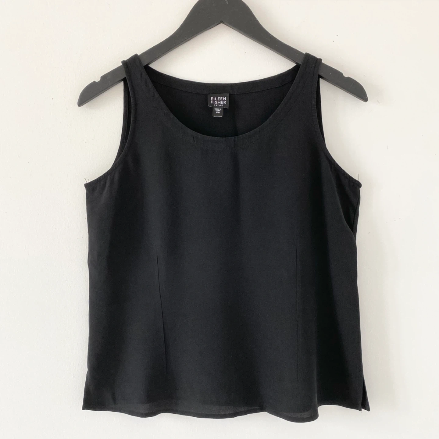 Eileen Fisher timeless sleeveless blouse. Features a relaxed fit, front and back darts for shaping and side slits. Made of lightweight 100% silk in a rich black colour. It's soft and drapes beautifully. It goes with everything - a great wardrobe staple! There's no staining, snags or damage. It's clean and in excellent condition.