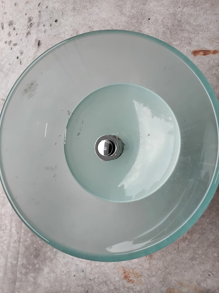Selling a round glass vessel sink. It's in good condition and ready to add a modern touch to your bathroom! The sink features a sleek design and is easy to clean. Perfect for a small space or a stylish upgrade
