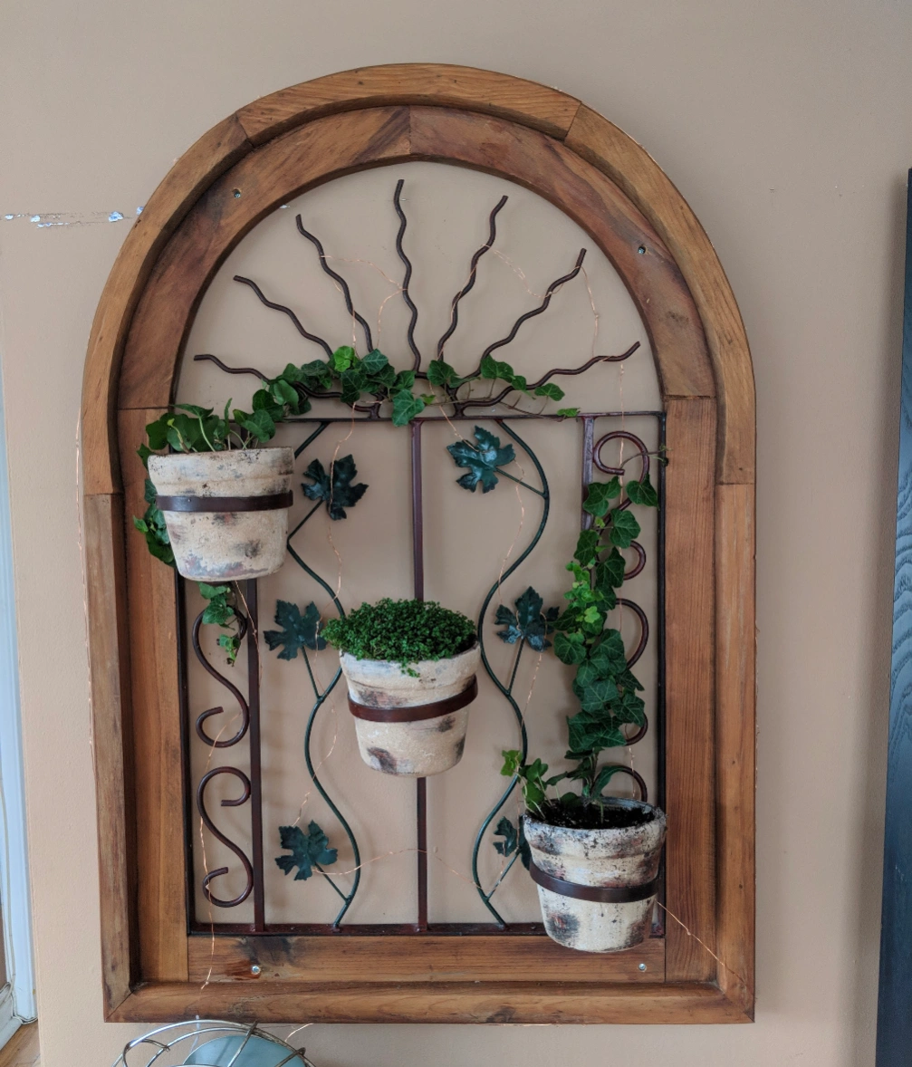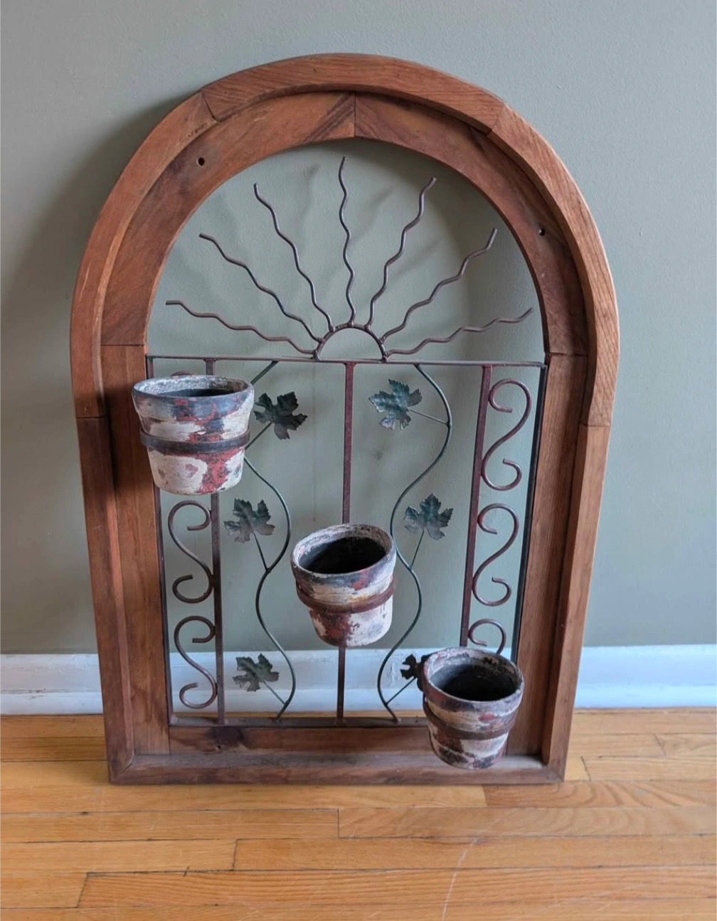 Selling a unique arched wooden window frame with attached planters. It's a charming piece to add some character to your home or garden. The frame has a rustic look with metal detailing, perfect for displaying small plants or flowers. It's in good condition and ready to be enjoyed!