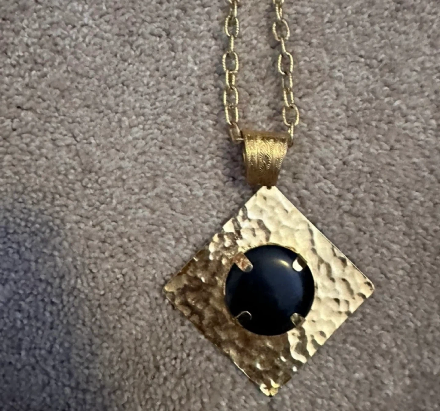 Selling a lovely gold-tone necklace featuring a striking black stone. The pendant has a unique hammered texture that catches the light beautifully. It's in great condition and ready to add a touch of elegance to any outfit