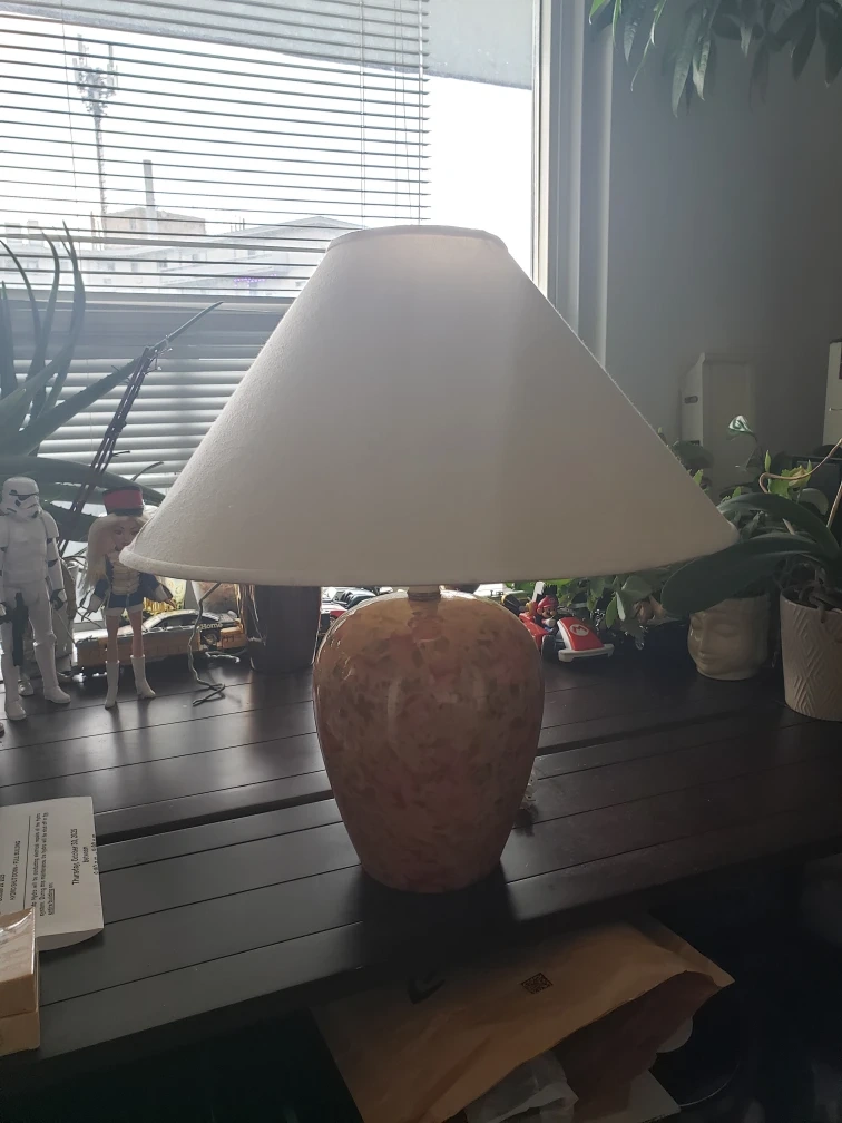 Selling a table lamp featuring a beige shade and a base with a unique speckled pattern. It's in great shape and would be a lovely addition to any room!