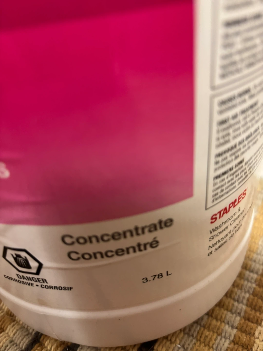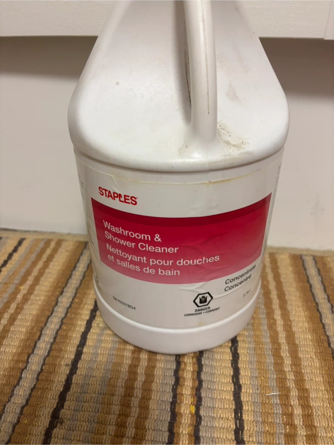 Selling a 3.78 L container of Staples Washroom & Shower Cleaner! It's a concentrate designed for cleaning washrooms and showers, helping to keep those spaces sparkling clean Used once so probably has 3.5litres left