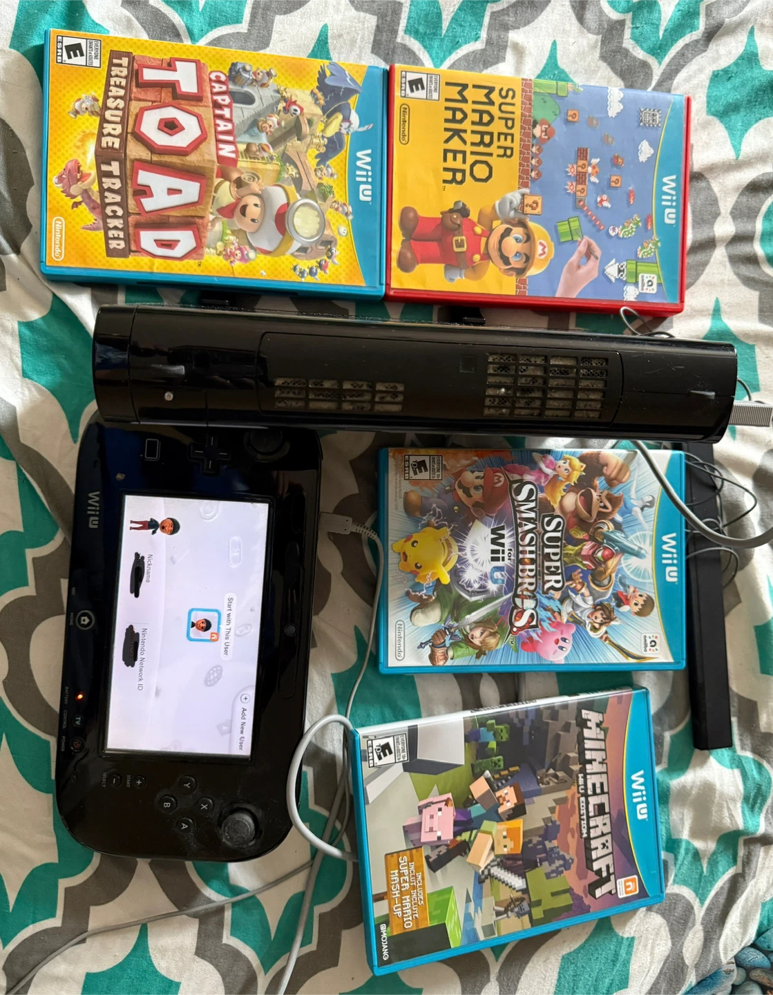 Selling a used Nintendo Wii U console in good condition! Includes the console, gamepad, sensor bar, and four games: Super Smash Bros for Wii U, Super Mario Maker, Captain Toad Treasure Tracker, and Minecraft Wii U Edition. Great for family fun!