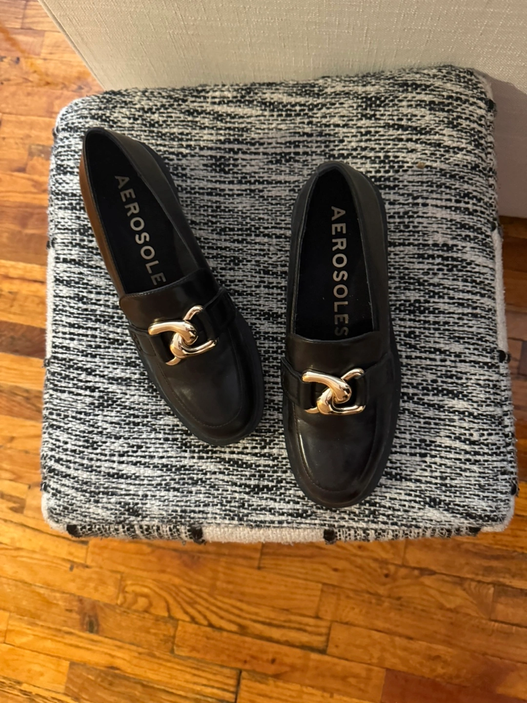 These Aerosoles loafers are a stylish and comfortable addition to any wardrobe! They feature a sleek black design with a gold chain detail. Perfect for dressing up or down!
