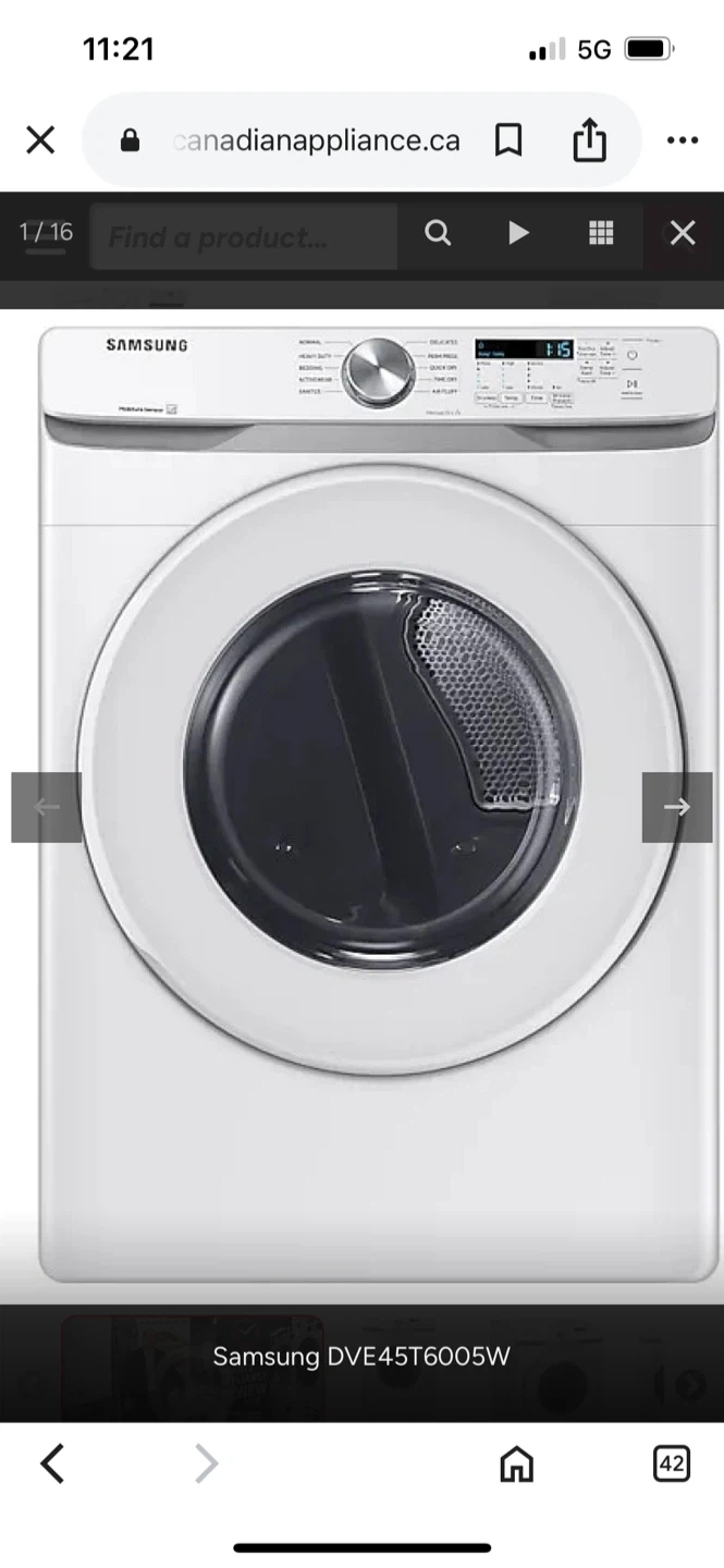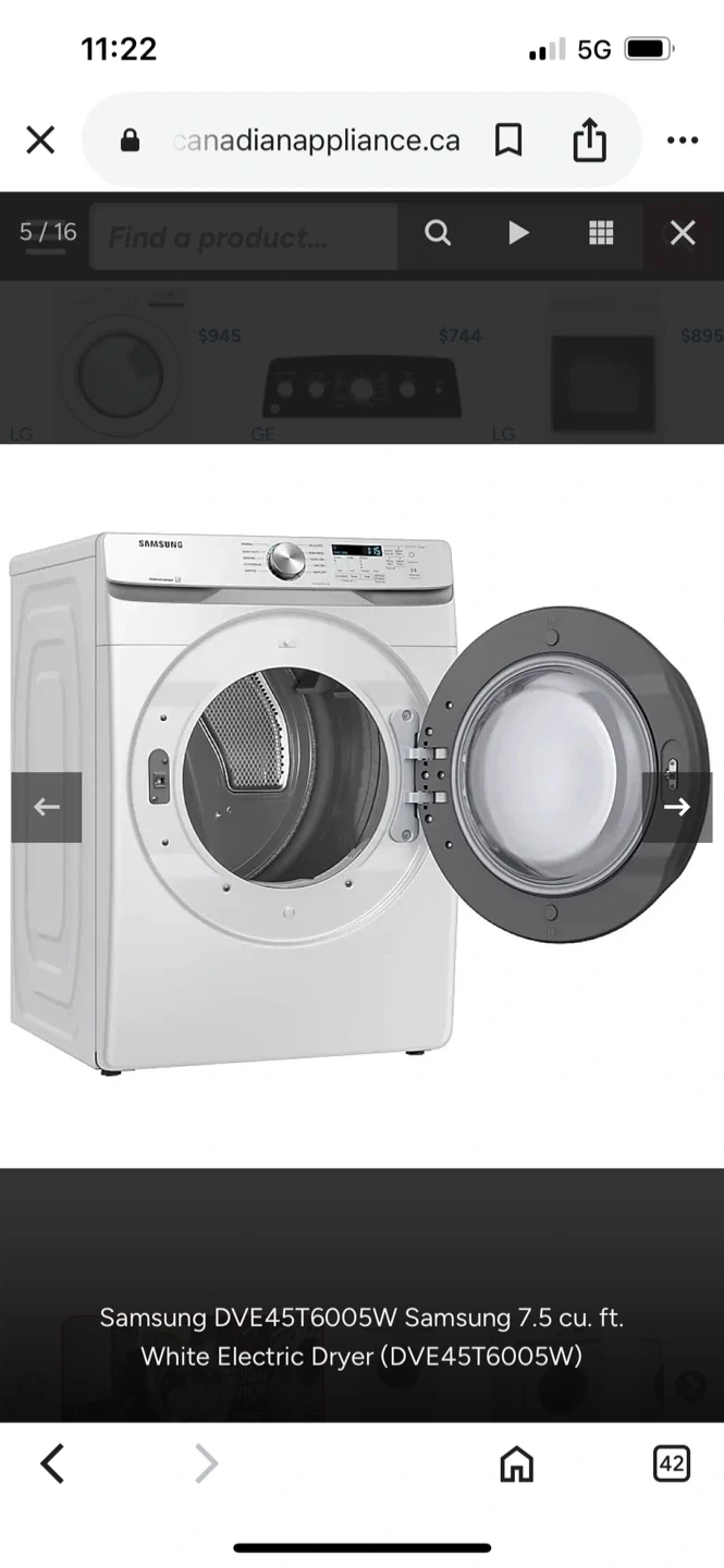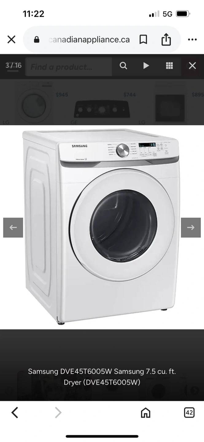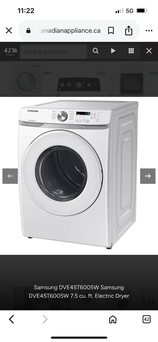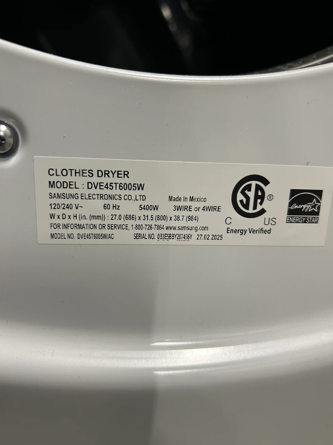 Home Depot Price $825 Selling a Samsung DVE45T6005W electric dryer. It's a 7.5 cu ft capacity model. The label indicates it's made in Mexico. Dimensions are approximately 27 inches wide x 31.5 inches deep x 38.7 inches high.