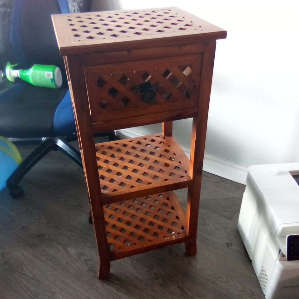 This is a cute wooden side table with a drawer and two shelves. It's perfect for a small space and could be used as a nightstand or end table. The table has a lattice design on the top, drawer front, and shelves. It's in good condition and ready for a new home!