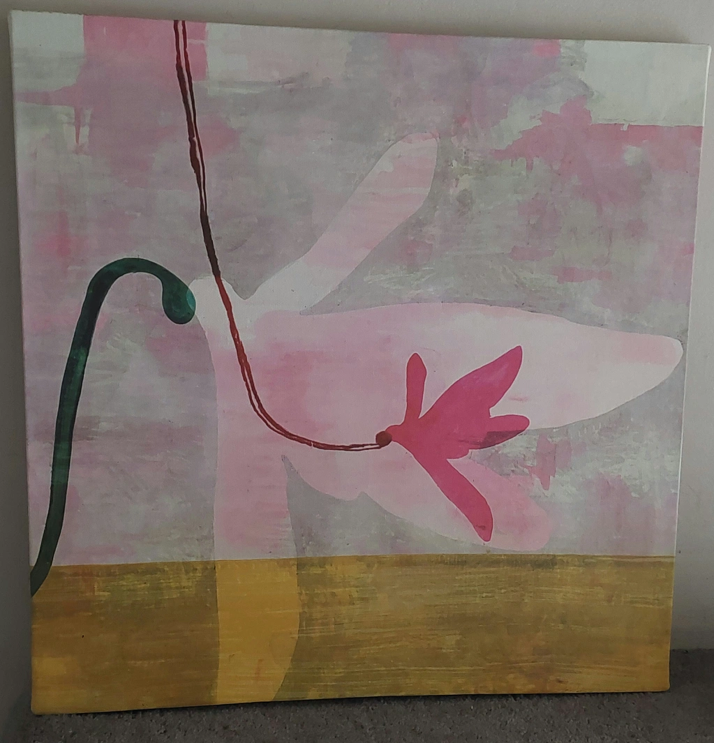 586This is a lovely abstract floral painting that would look great in any room! The colours are soft and calming, featuring pink, white, green, and gold accents. It's perfect for adding a touch of modern art to your home.