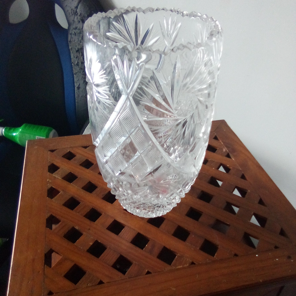 Selling a lovely crystal vase. It has a beautiful cut-glass design that would look great with flowers or as a decorative piece on its own