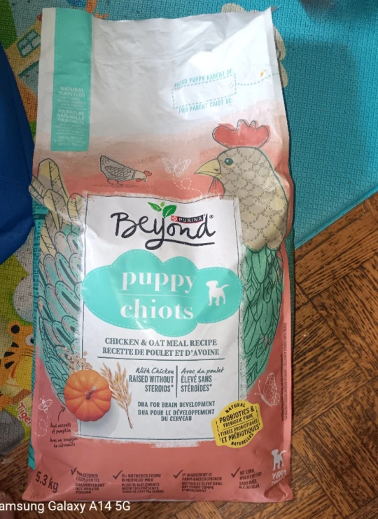 Selling a bag of Beyond Purina Puppy Chiot Chicken & Oat Meal Recipe dog food. It's a 5.3 kg bag, perfect for your growing pup! The recipe includes chicken and oat meal, and it's made with natural probiotics and prebiotics. It also contains DHA derived from fish oil for brain development, and it has accents of pumpkin! sealed bag 647-203-0411