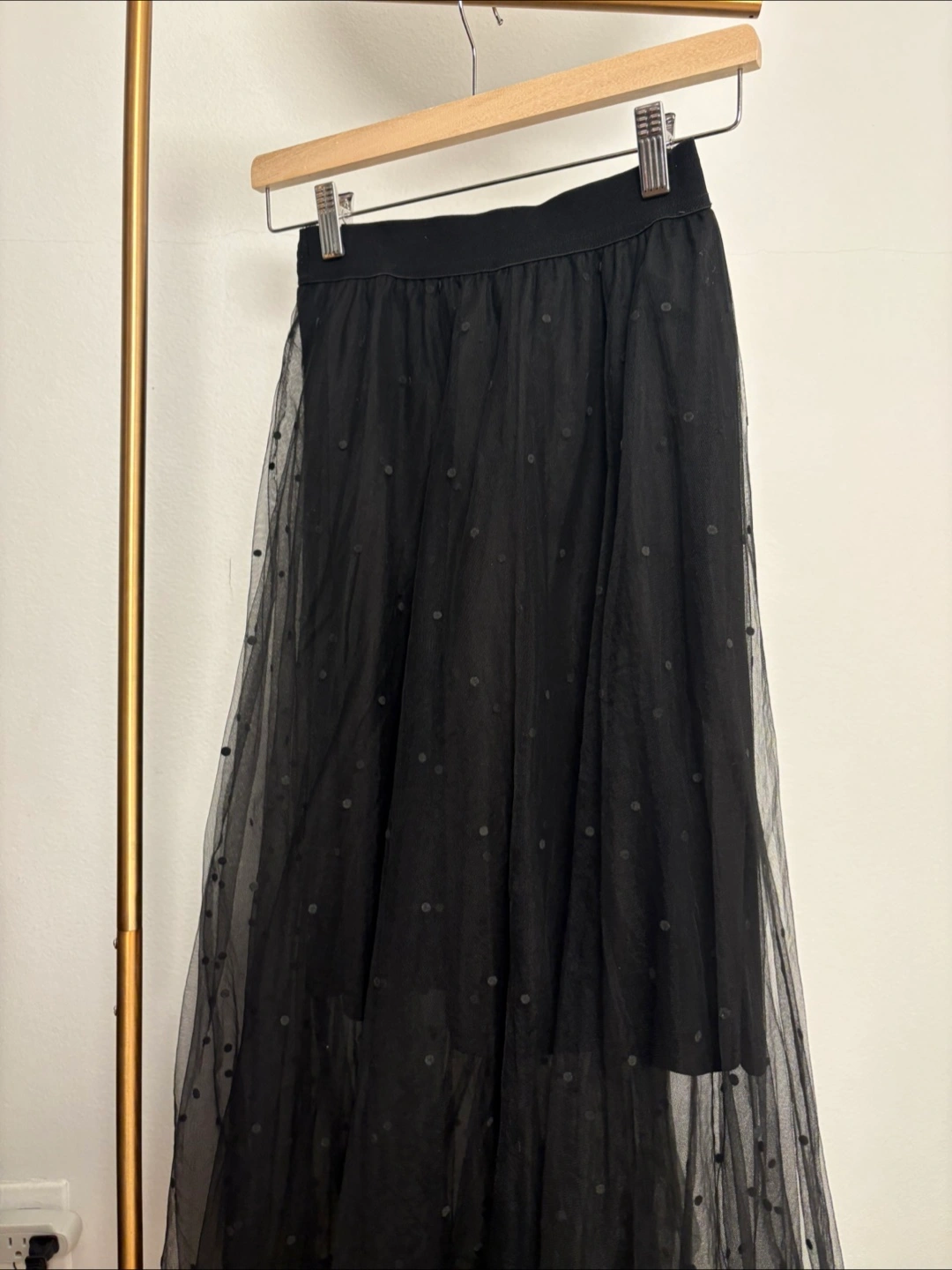 Here's a lovely black tulle skirt! It's in great condition and ready for a new owner. It's perfect for adding a bit of elegance to any outfit. Feel free to reach out if you have any questions! Stretchy waistband.