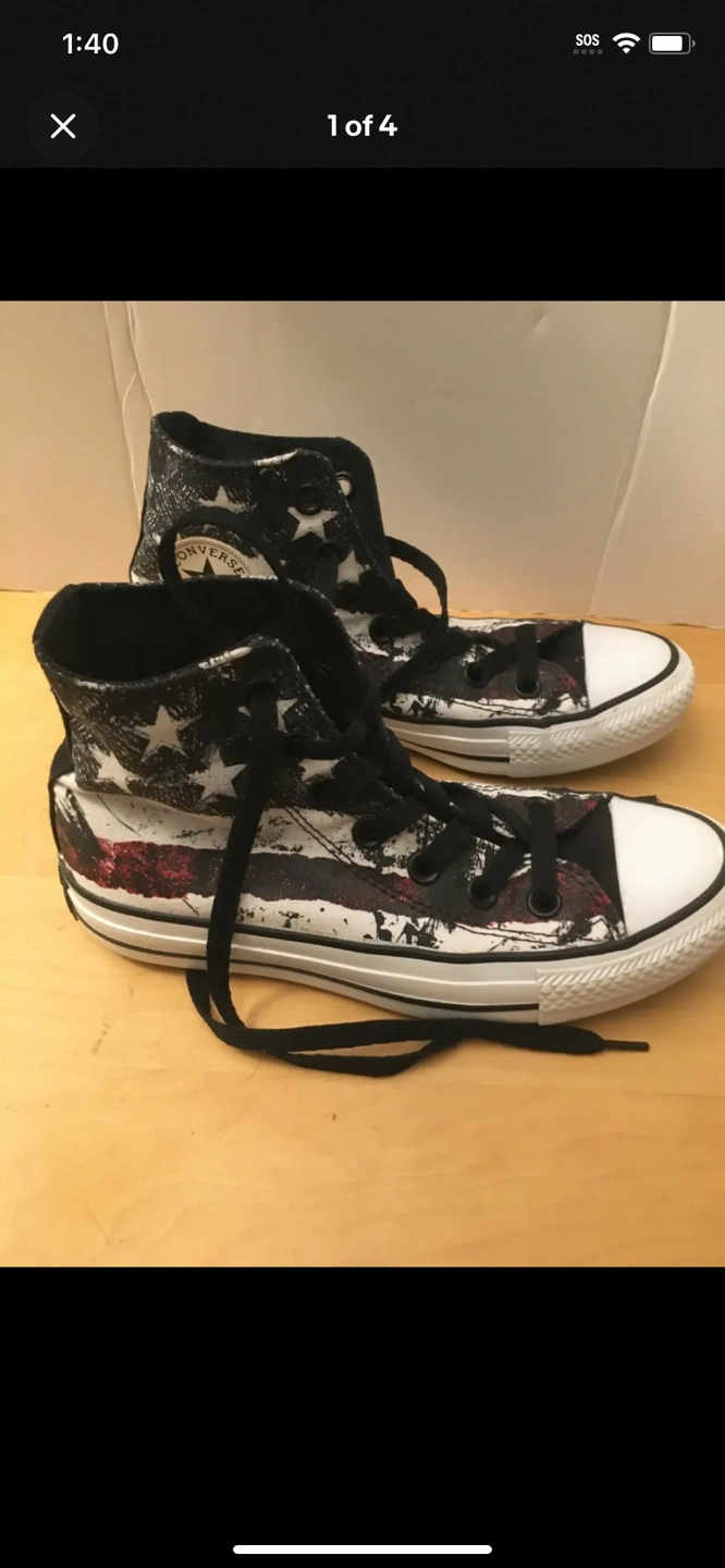CHUCK TAYLOR AMERICAN FLAG ALL STAR CONVERSE SHOWS MENS 3 / WOMANS 5 - appear to maybe have been worn once or twice,, or maybe just around the house as they look very close to new when you look at the bottom of the shoes. see pictures and gauge for yourself.
