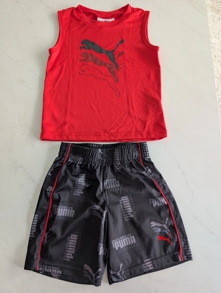 Two adorable Puma outfits in red and black. Both in excellent condition, size 2T. One is a tee and shorts set, the other a tank top and shorts.