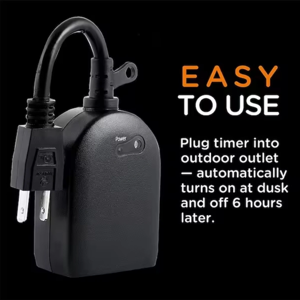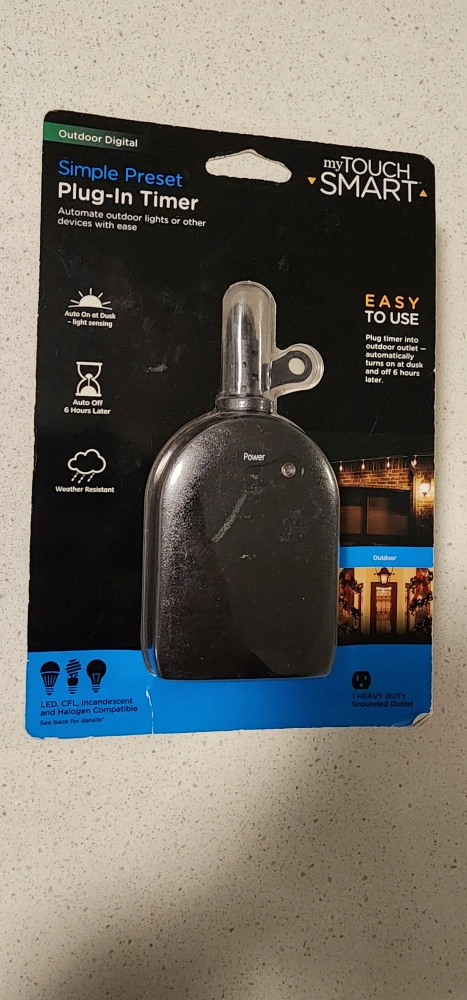 Selling a myTouchSmart Outdoor Digital Plug-in Timer. This simple preset timer automates your outdoor lights or other devices with ease. It automatically turns on at dusk and off 6 hours later. It's also weather resistant!