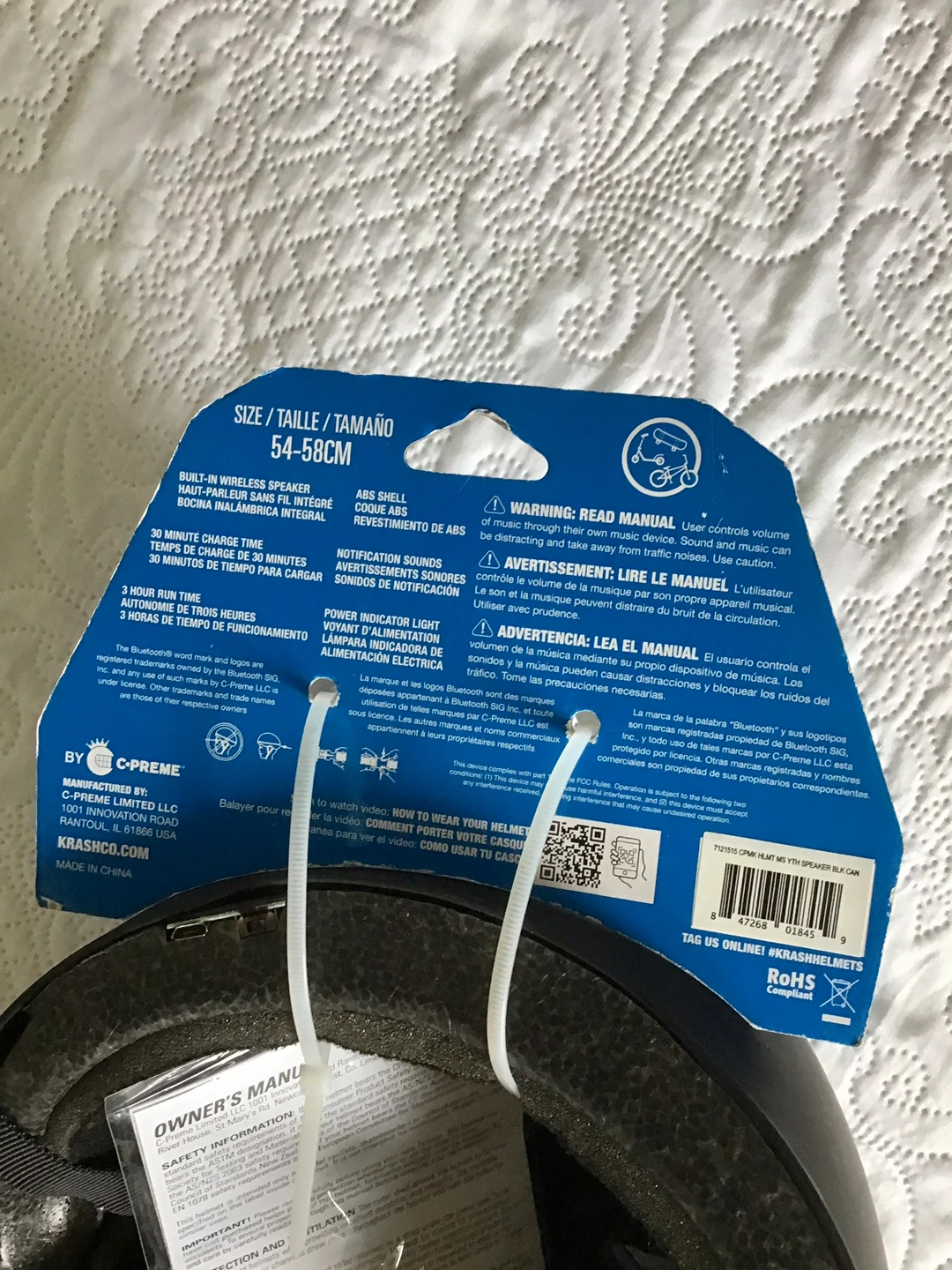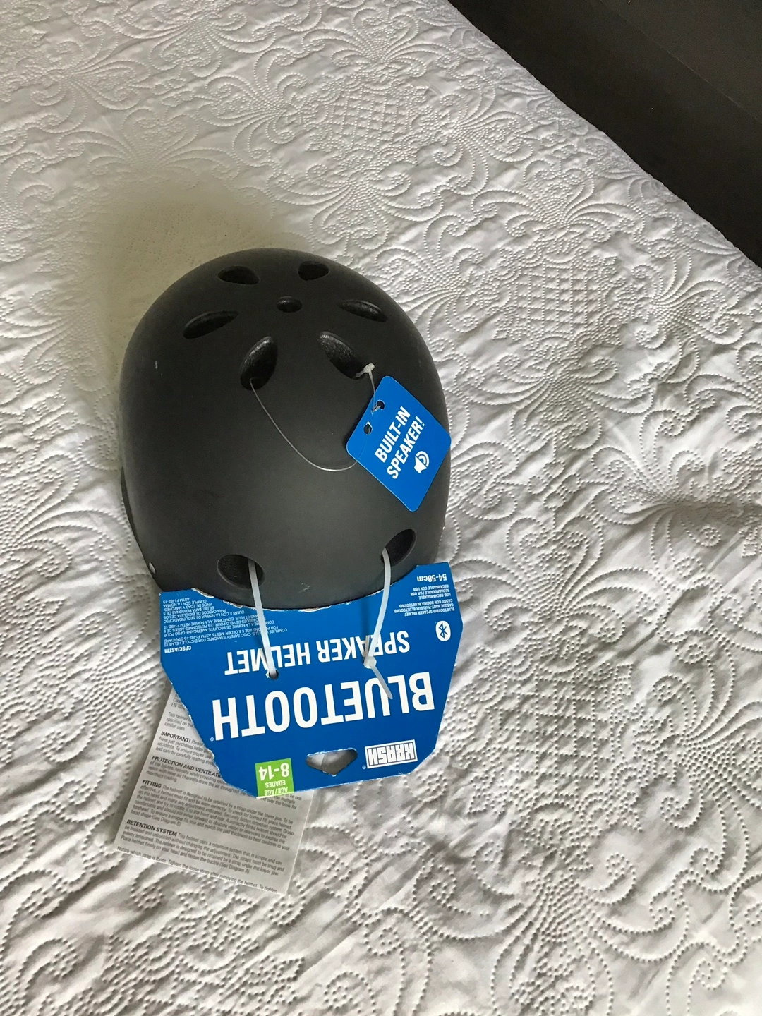 Selling a brand new C-Preme Bluetooth Speaker Helmet! It's black and size 54-58cm. This helmet features a built-in wireless speaker. It only takes 30 minutes to charge and provides 3 hours of runtime!