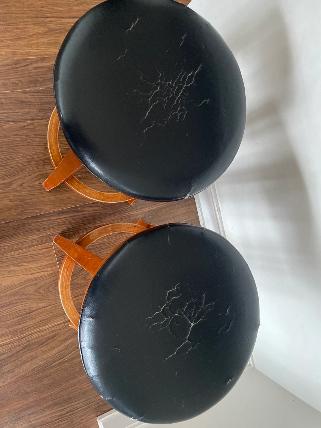 Give for free a pair of bar stools. They have black seats and wooden frames. The seats show some wear and tear, as seen in the photos, but it can be a project for restoring .