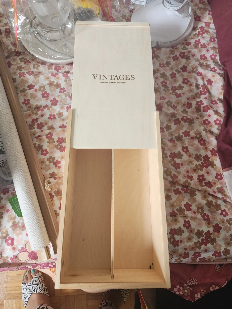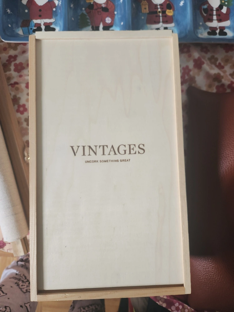 Selling a Vintages wooden box. It's in great condition and ready for a new home. Perfect for storing wine bottles or other items. The box has the text "Vintages Uncork Something Great" printed on the lid.