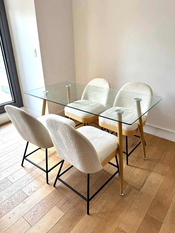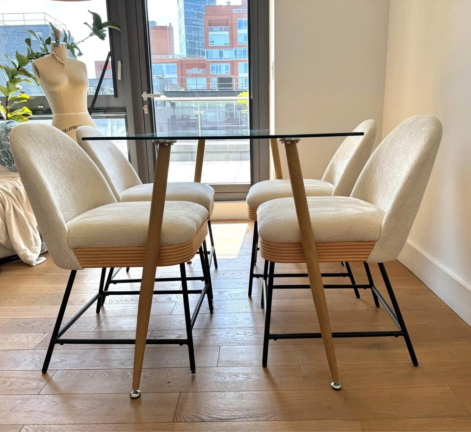 Love these chairs but the set didn’t fit in my apartment. Still in great condition! Some wear on the feet of the chair legs.