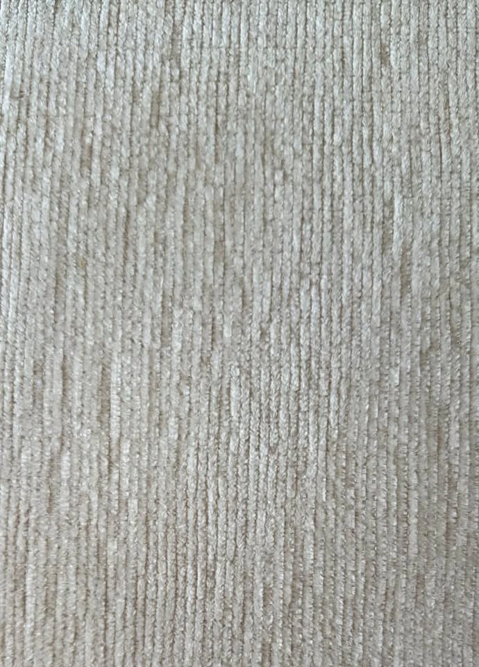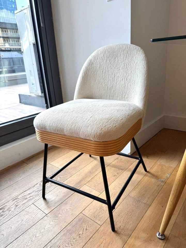 Chairs are a boucle/corduroy fabric with wooden base and metal legs.