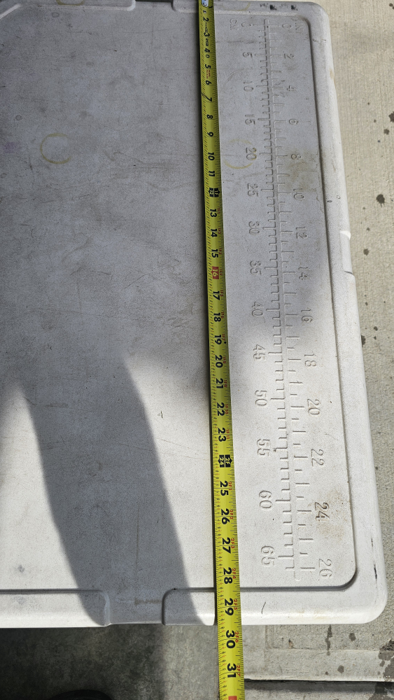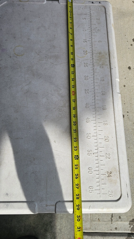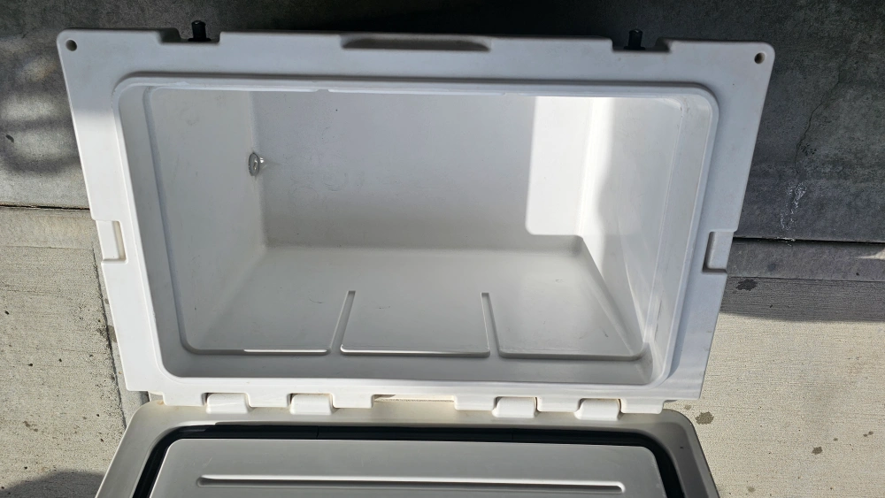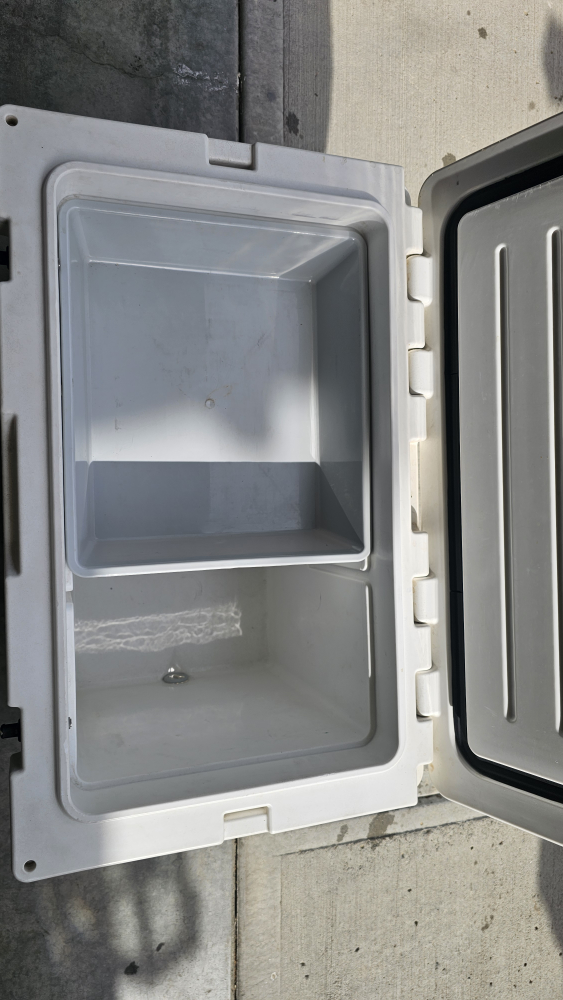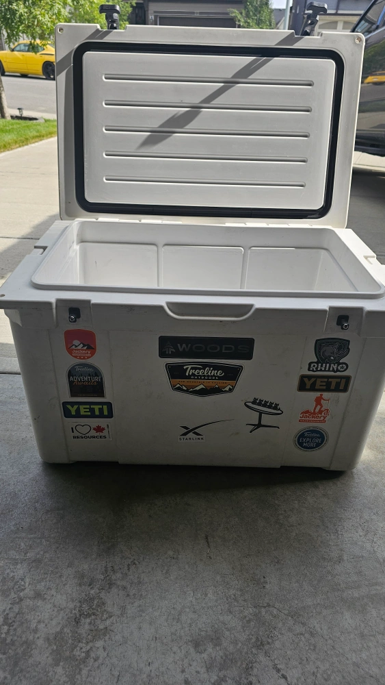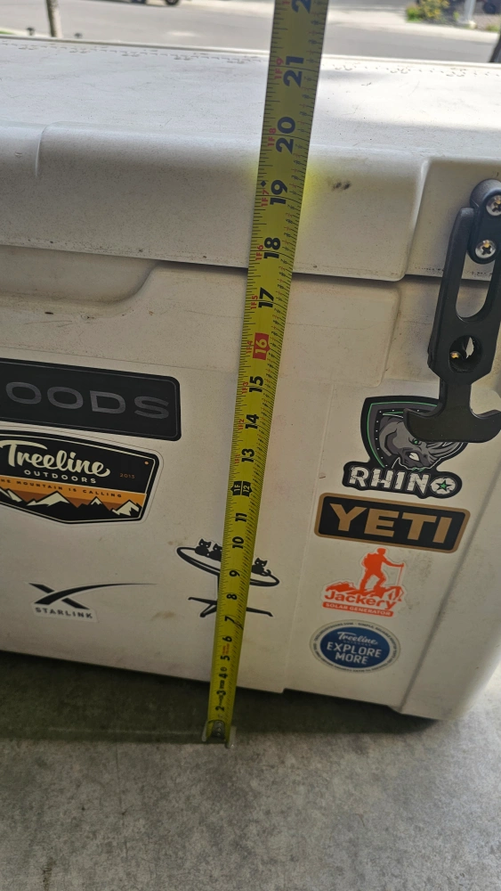 Selling a large Woods cooler. It's white and has some stickers on it. It measures approximately 25 inches in length and 16 inches in height. Great for camping or picnics!