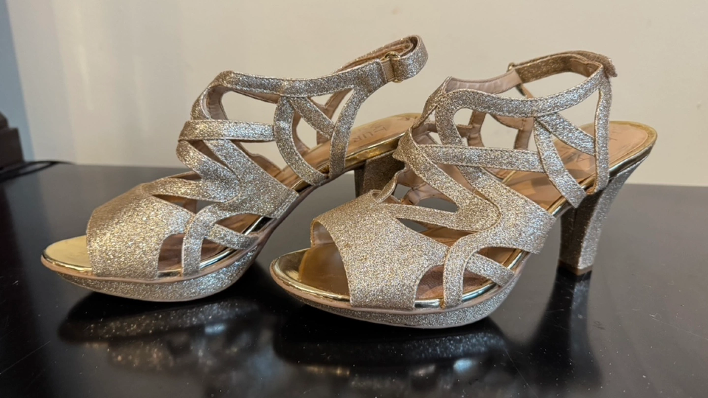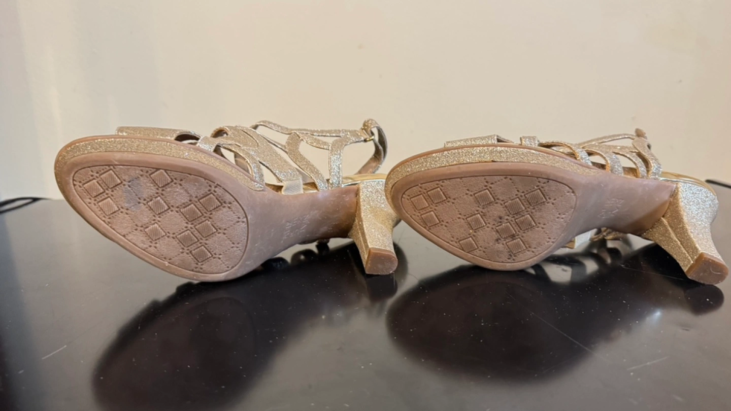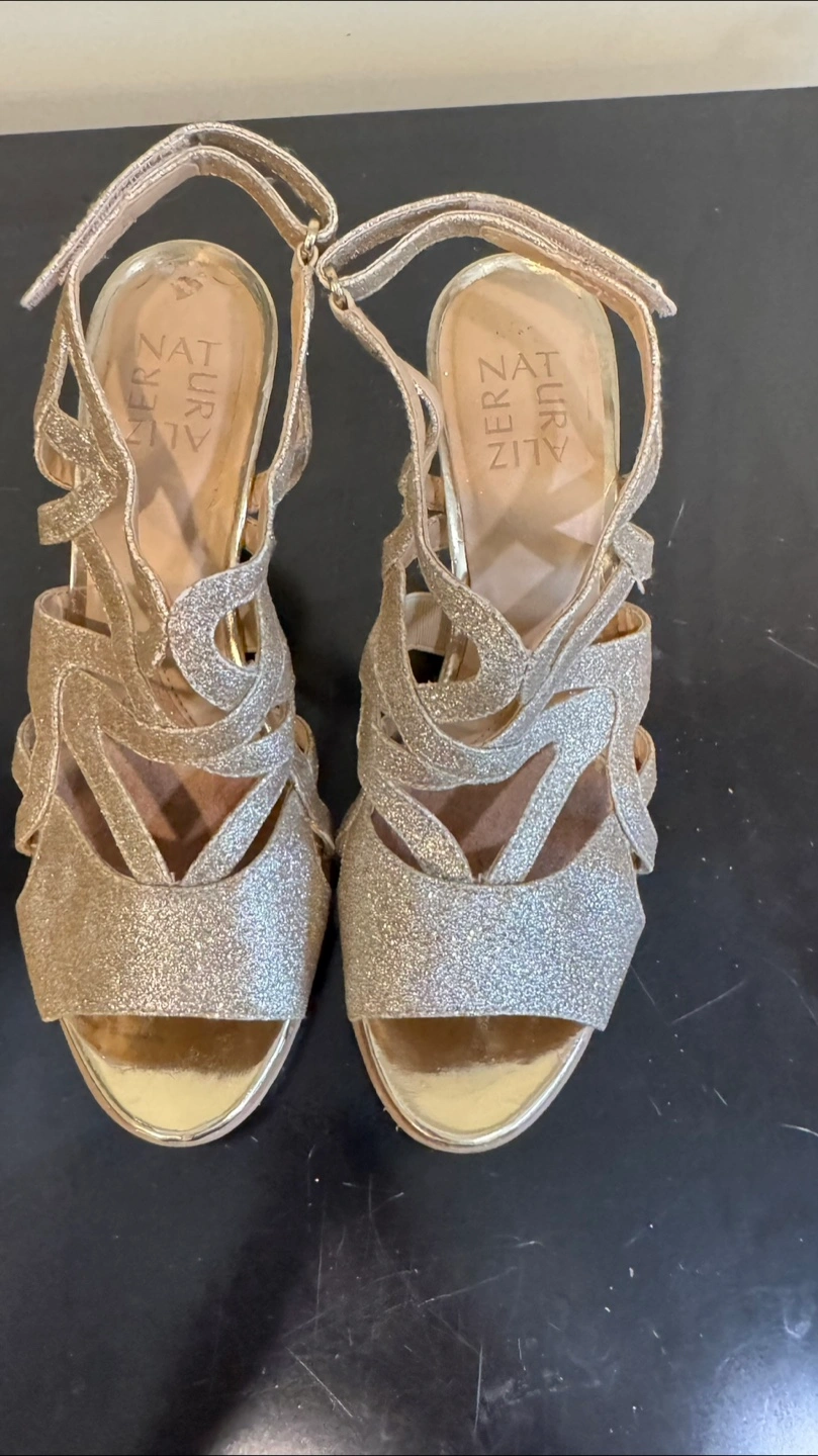 These are Naturalizer gold heels in a size 7.5M. They have a glittery finish and a strappy design. Perfect for dressing up!