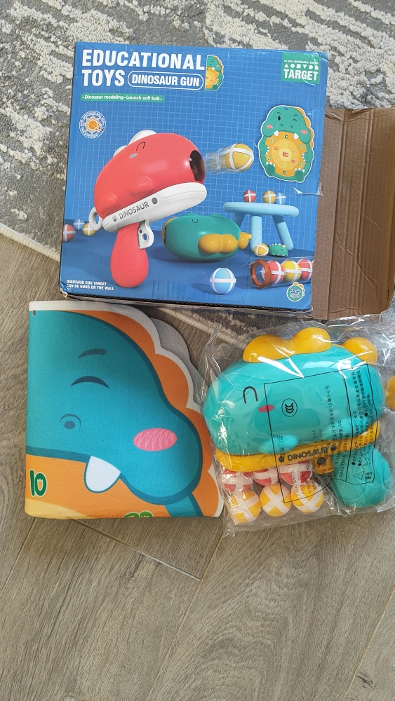 I'm selling a brand new Educational Toys Dinosaur Gun set! It's still sealed in its original packaging, never been opened. Perfect for kids aged 3 and up, this set includes a dinosaur gun, a target, and soft balls for safe play. Great for dinosaur lovers!