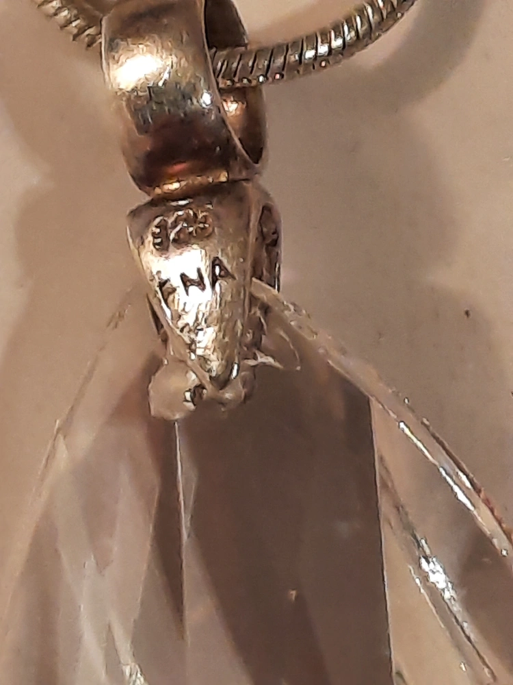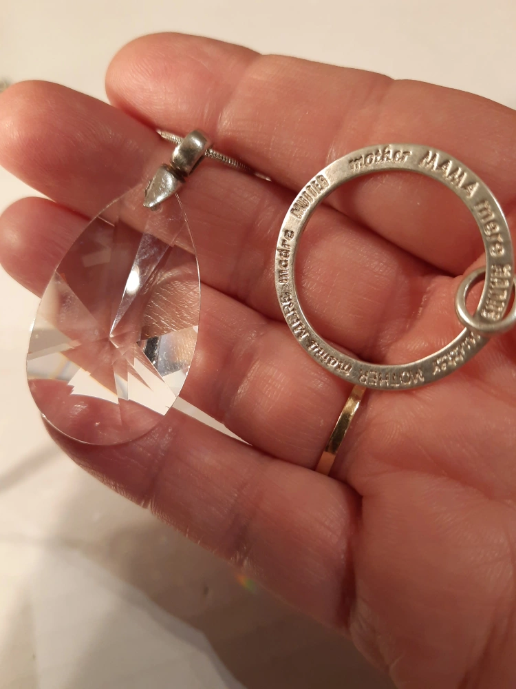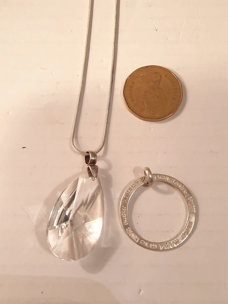 Selling a lovely ENA pendant necklace. The pendant is a clear, teardrop-shaped crystal. The chain and pendant setting are stamped 925 silver. Also including a second pendant with 'mother' written in different languages around the ring. A beautiful set!pick up in oshawa