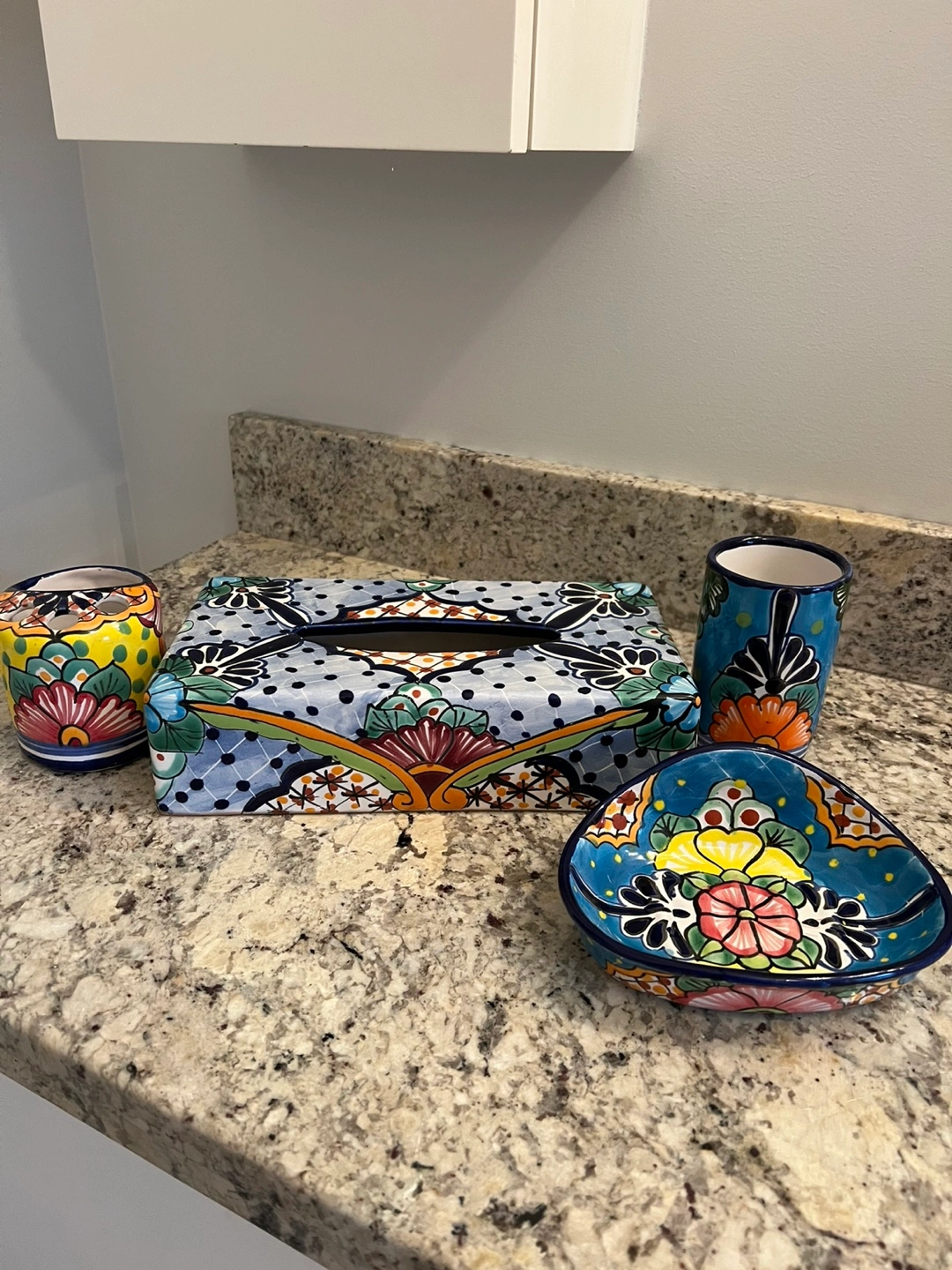 Selling a beautiful hand-painted Talavera bathroom set. This set includes a tissue box cover, two tumblers, and a small soap dish. The vibrant colours and intricate designs would add a lovely touch to any bathroom! Kitty included!