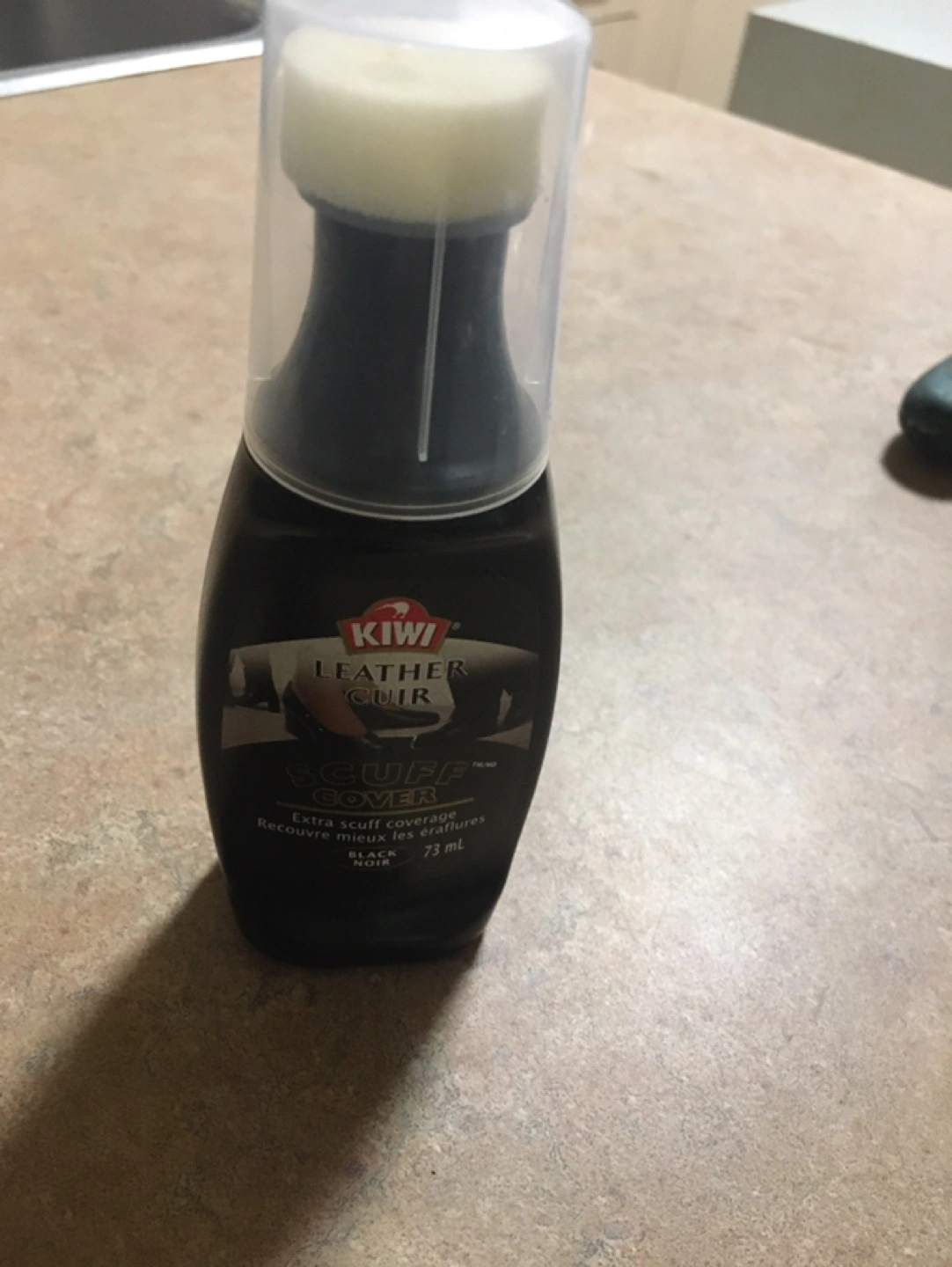 Selling a bottle of Kiwi Leather Cuir Scuff Cover in black! It's great for covering up scuffs and keeping your leather looking its best. The bottle contains 73 ml of product, perfect for keeping your shoes and other leather items looking sharp!