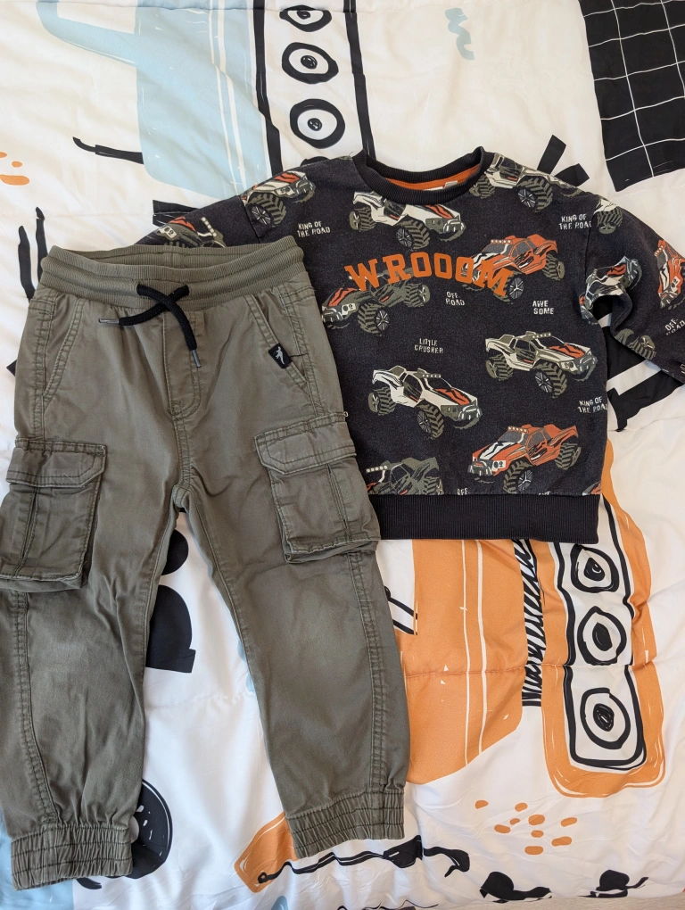 Selling a stylish and cozy outfit from KappAhl, a high-quality Swedish brand. The set includes a monster truck printed sweatshirt and a pair of comfortable cargo pants. Both items are size 2T and in great condition.