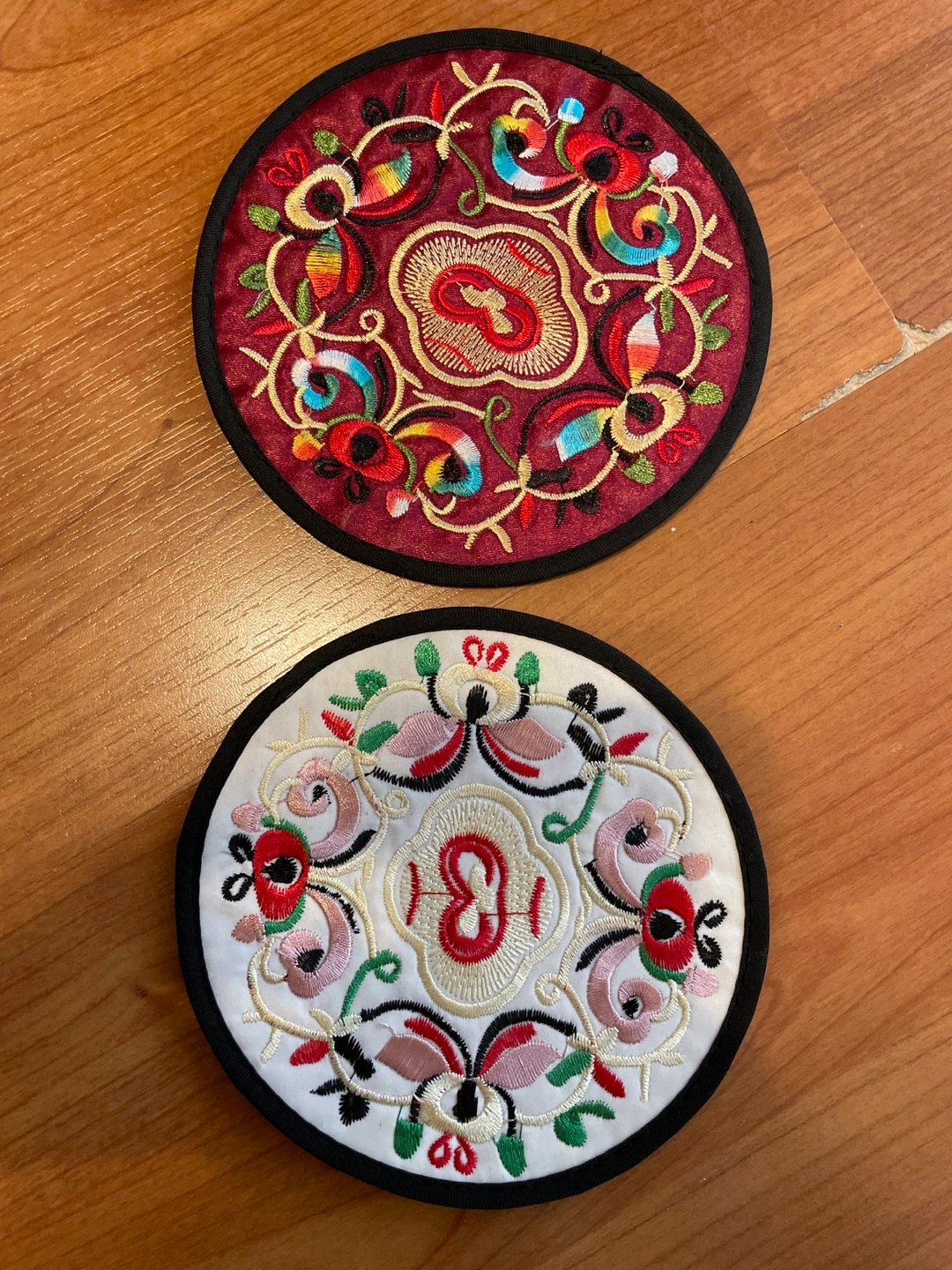 Selling a set of two embroidered coasters. One is a lovely red and the other is white. They have a beautiful floral design that would look great in your home!