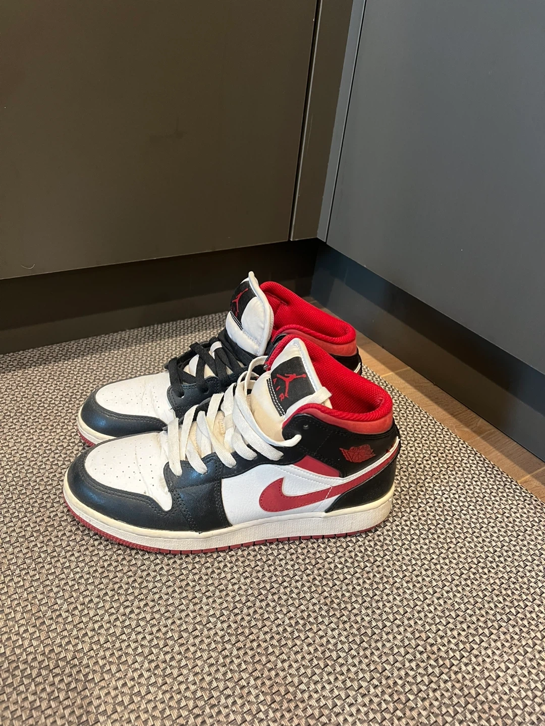 Selling a pair of Air Jordan 1 Mid sneakers in a classic black, white, and red colourway. Pick up Brentwood