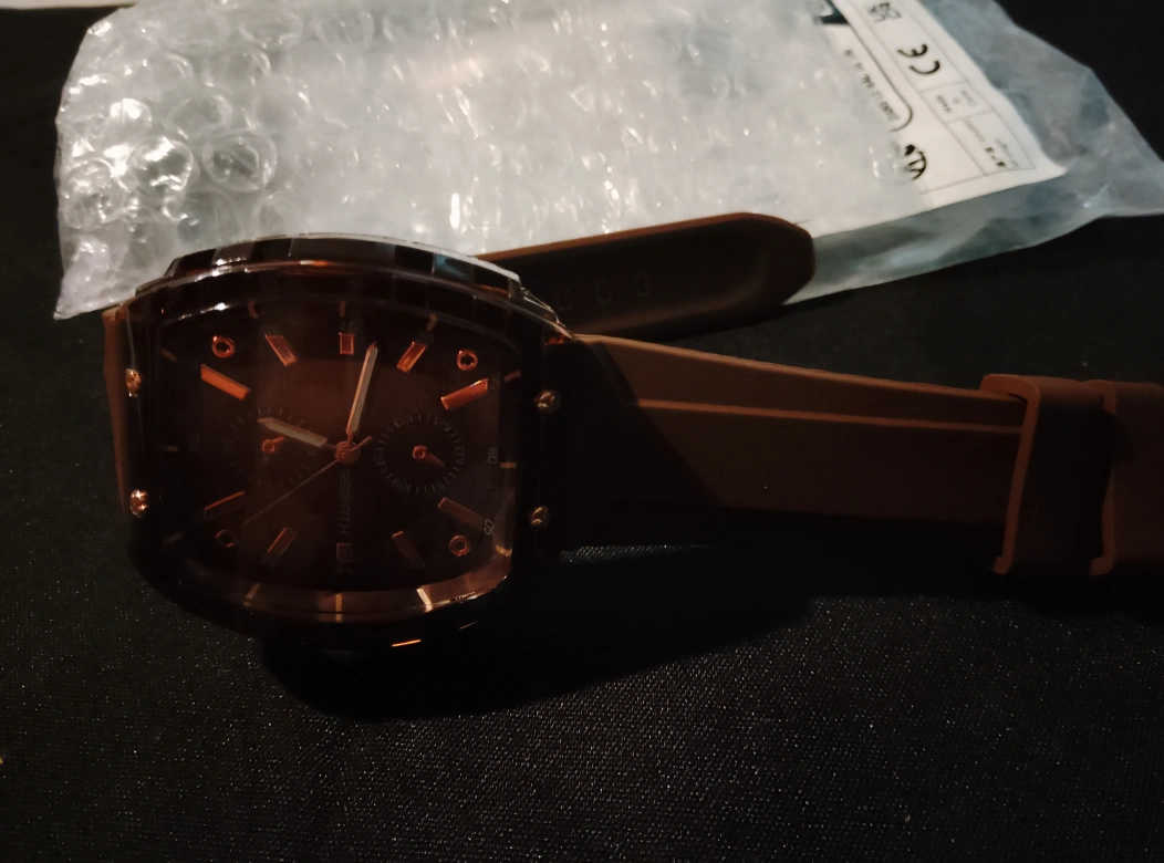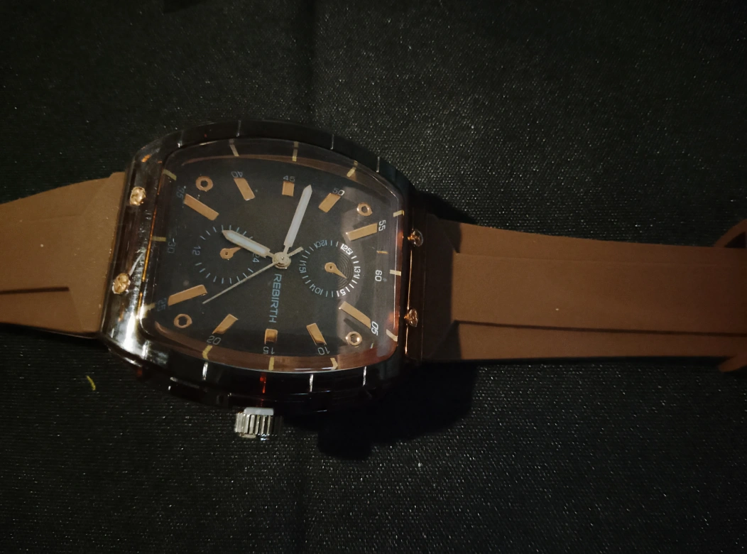 Selling a stylish Rebirth watch with a brown strap. It's brand new and ready to wear!