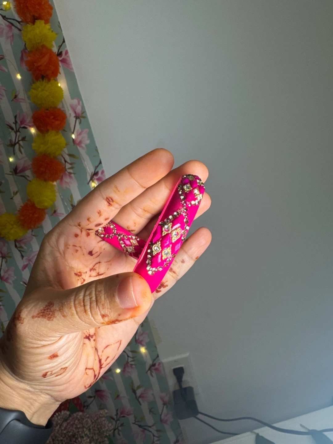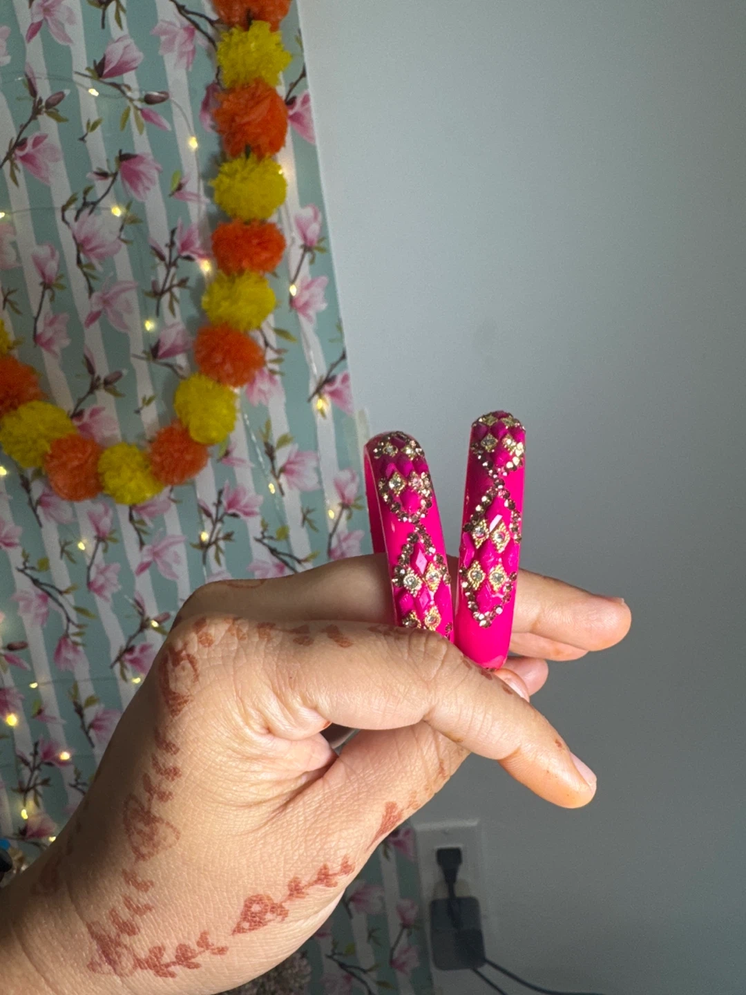 Selling a pair of beautiful pink and gold bangles. They have an intricate design with gold accents and would be perfect for a special occasion or to add a pop of colour to your everyday look