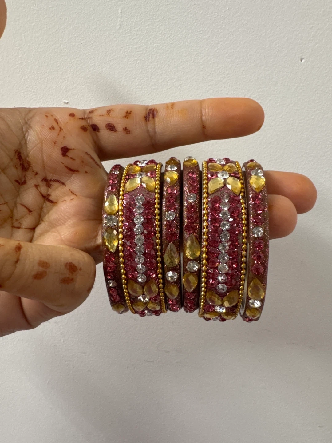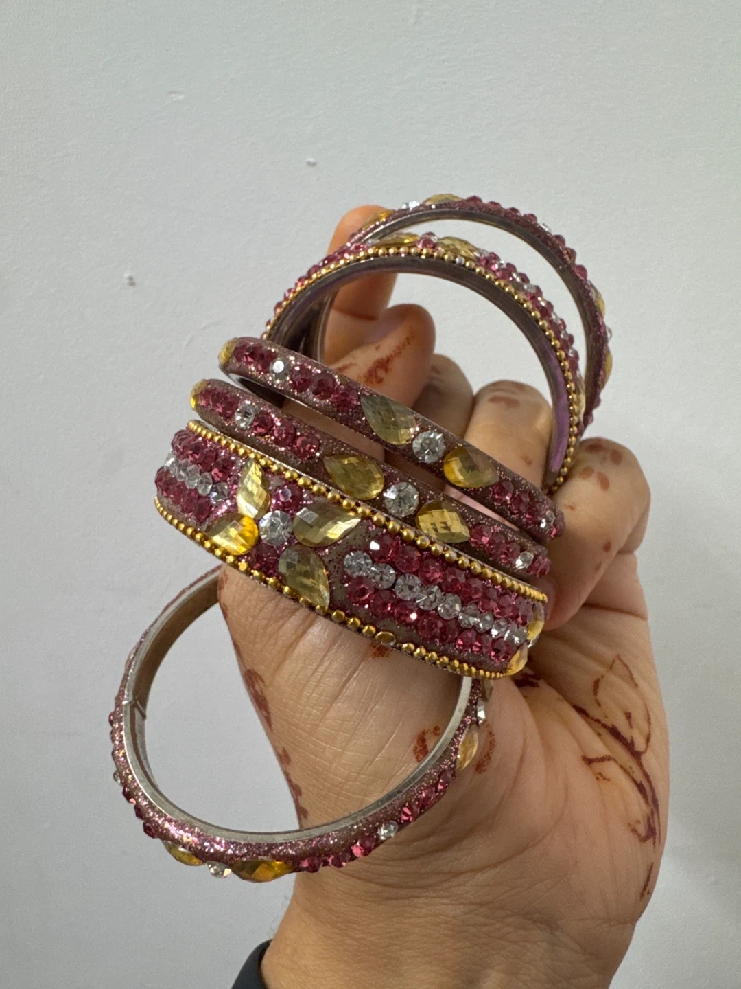 Selling a set of decorative bangles. They are adorned with pink, clear, and gold-coloured gems. Perfect for adding a touch of sparkle to any outfit!
