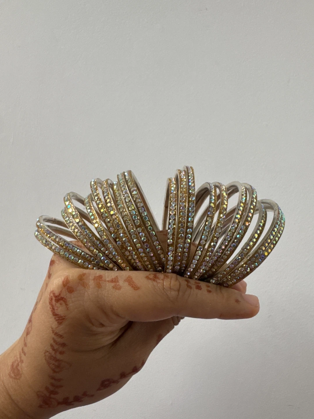Selling a set of sparkly 24 bangles with rhinestone detailing! These bangles have a gold tone and would be a great addition to any outfit or occasion. They are in great condition and ready for a new home