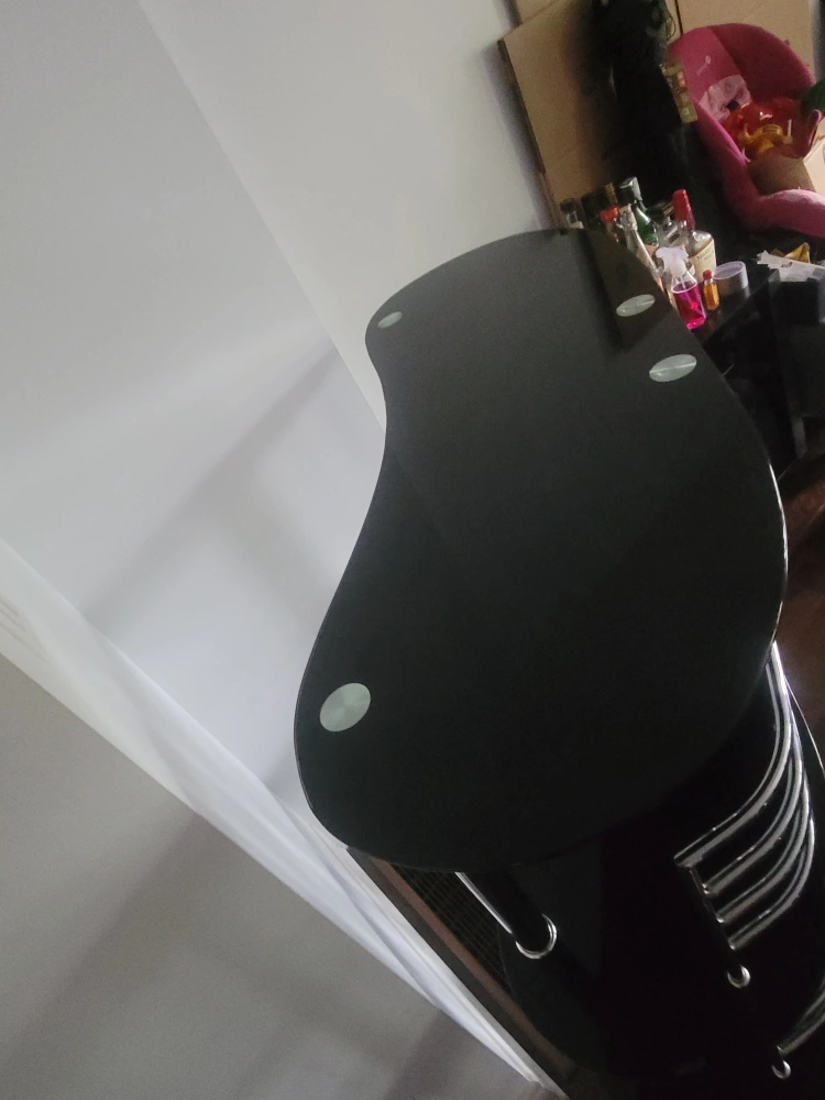 Selling a black glass bar table. It's in great shape and would be a nice addition to any home bar area. Features a sleek design with chrome accents and multiple shelves for storage.