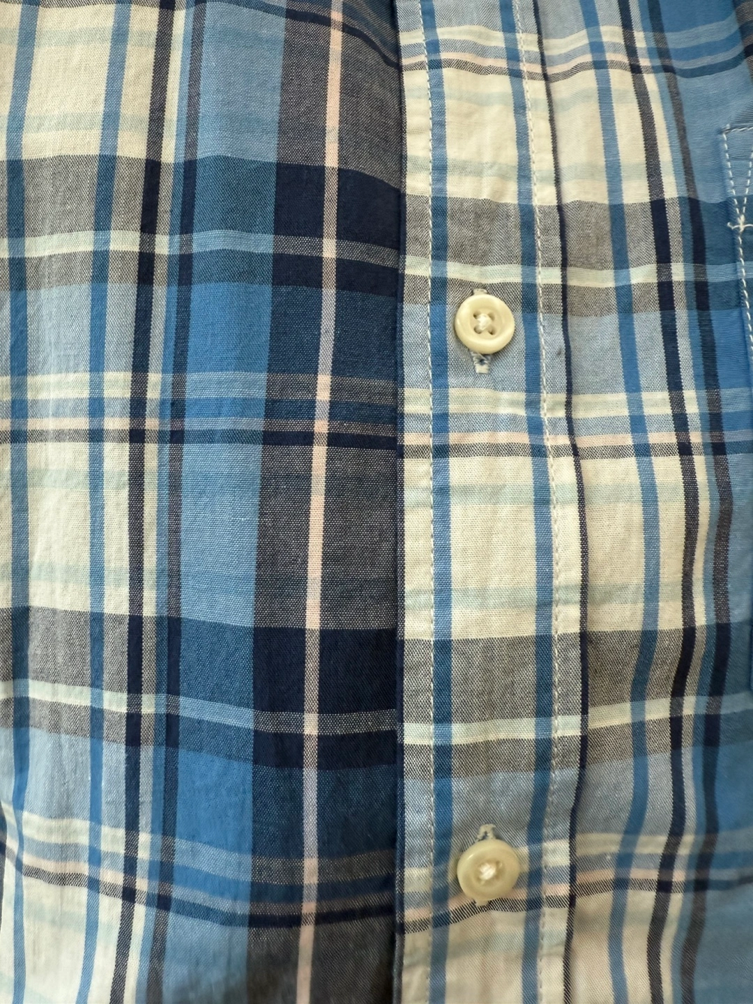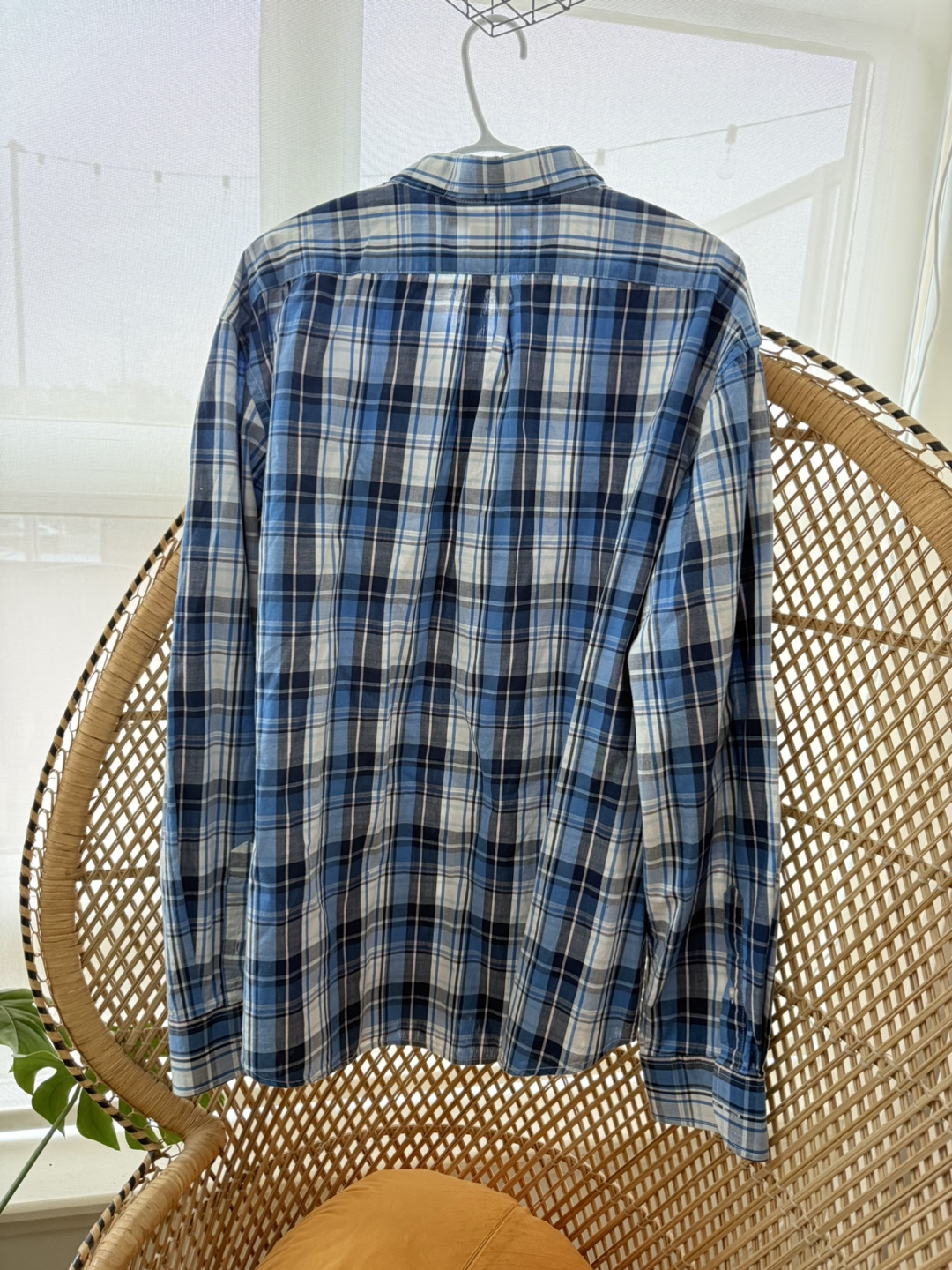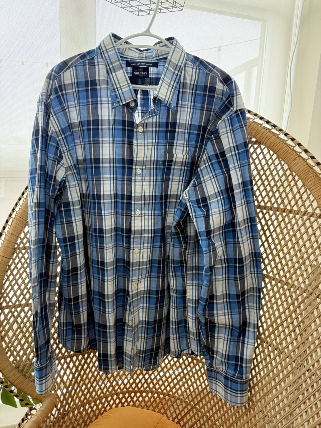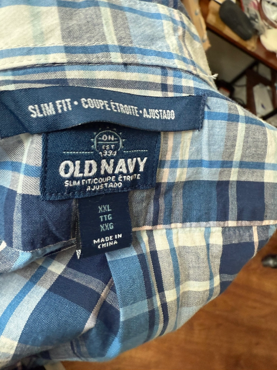 Here's a rarely used Old Navy shirt in size XXL. It features a blue and white plaid pattern and a slim fit. Perfect for a casual look!