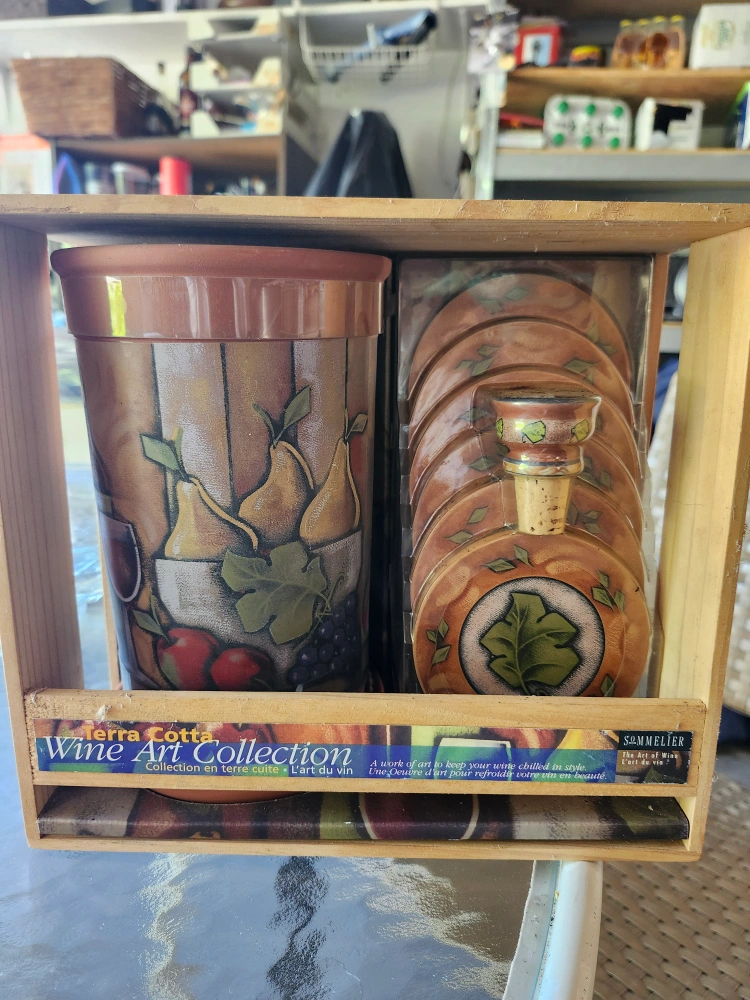 Terra Cotta Wine Art Collection in great condition! Features a beautiful design and includes a carafe and coasters, perfect for keeping your wine chilled in style