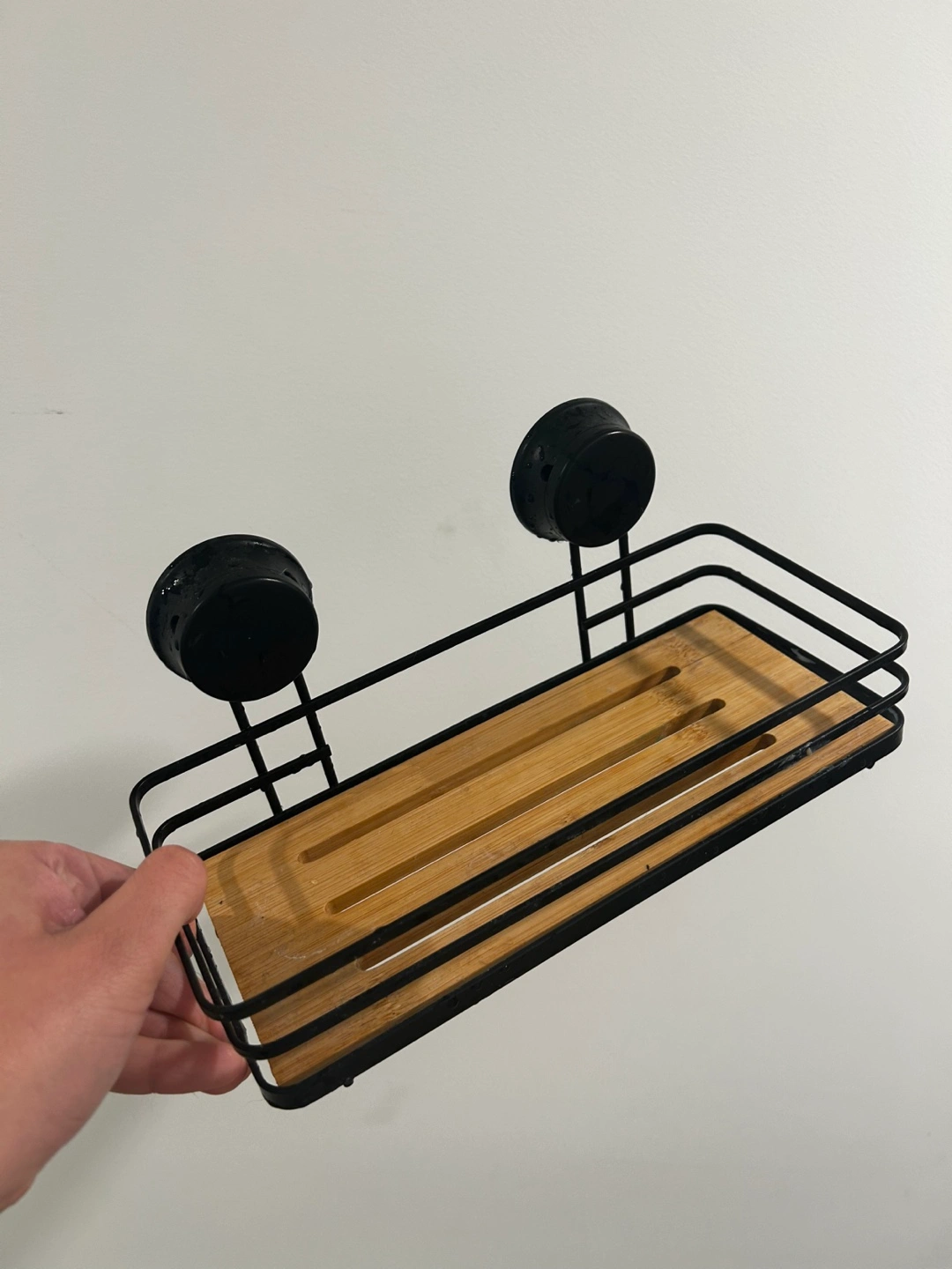 A shower shelf with suction cups. It's a combination of black metal and bamboo. Didn’t work well for me, but maybe it will for you. Free!