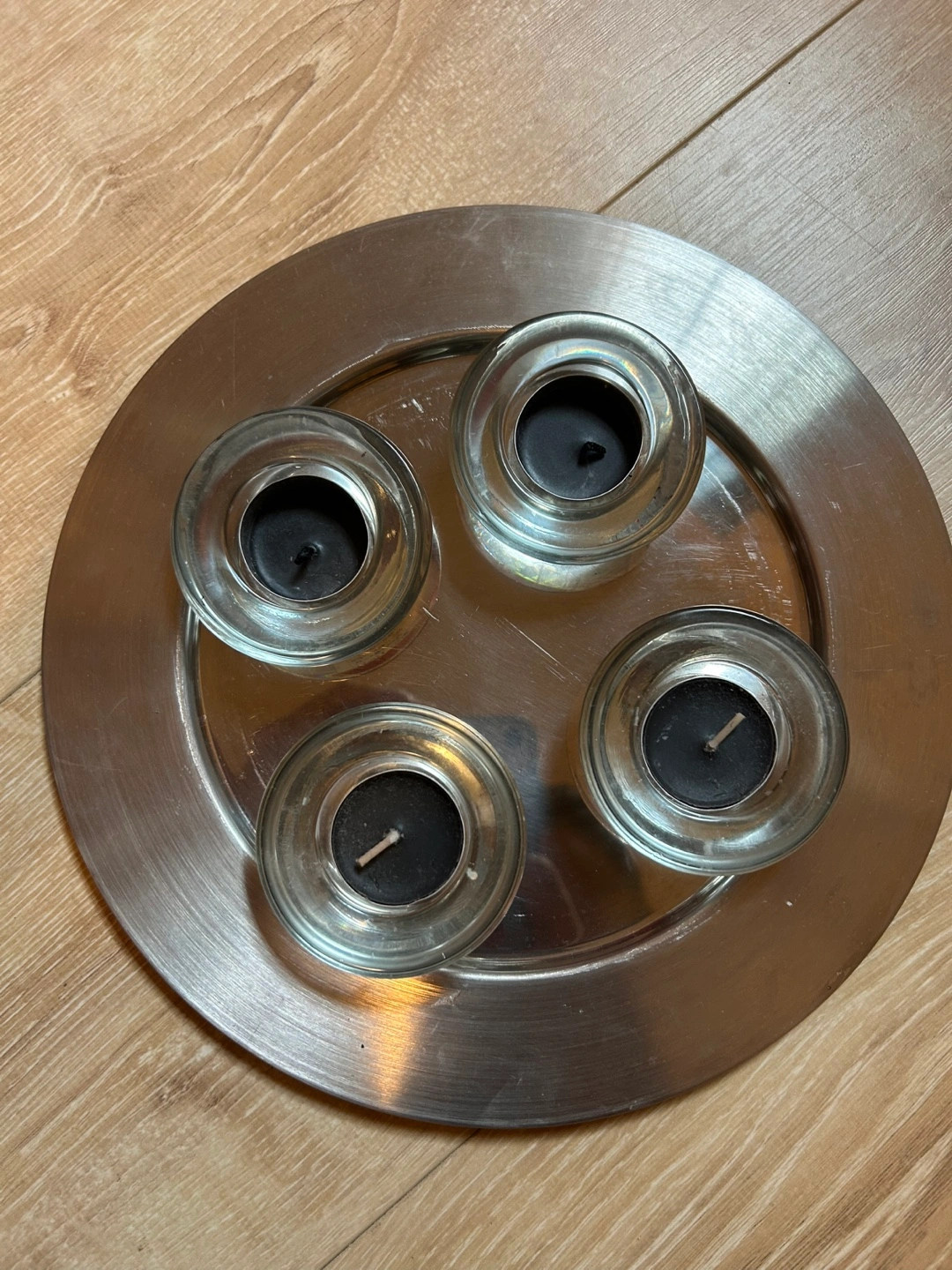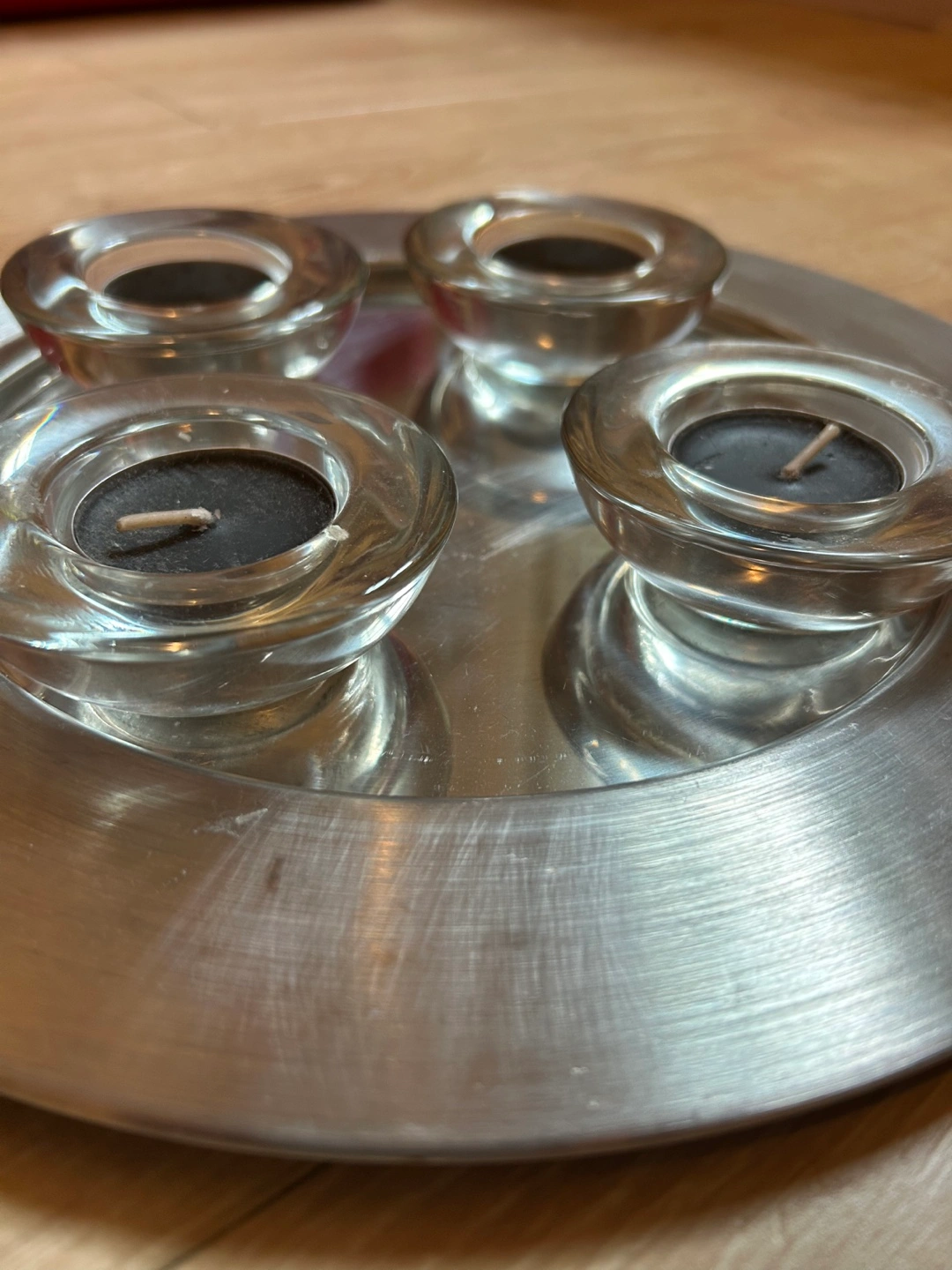 Selling a candle holder with four clear glass cups. It's in great condition and ready to add some ambiance to your space!