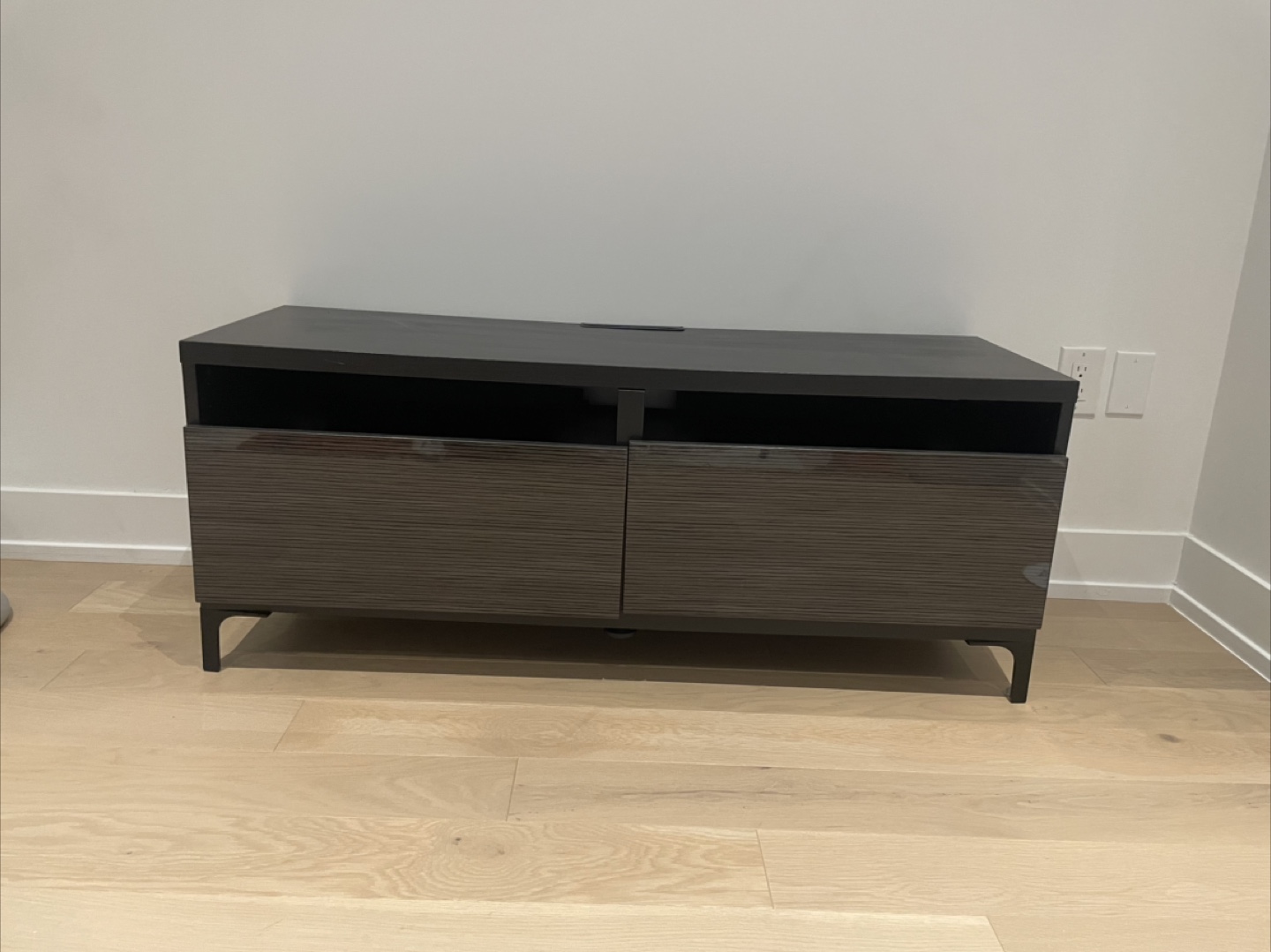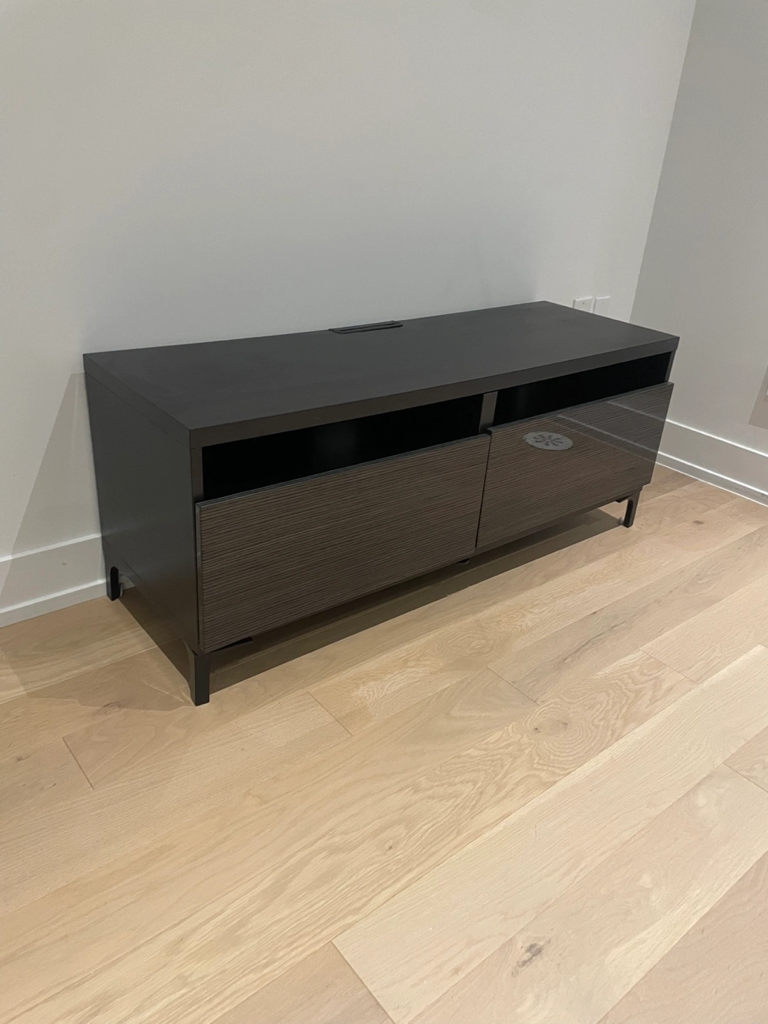 Selling a media console table in good condition! It features a sleek design with two doors and open shelving for your media components or decorative items. The dark brown colour would fit well in any living room. Light scratches as shown in pictures.