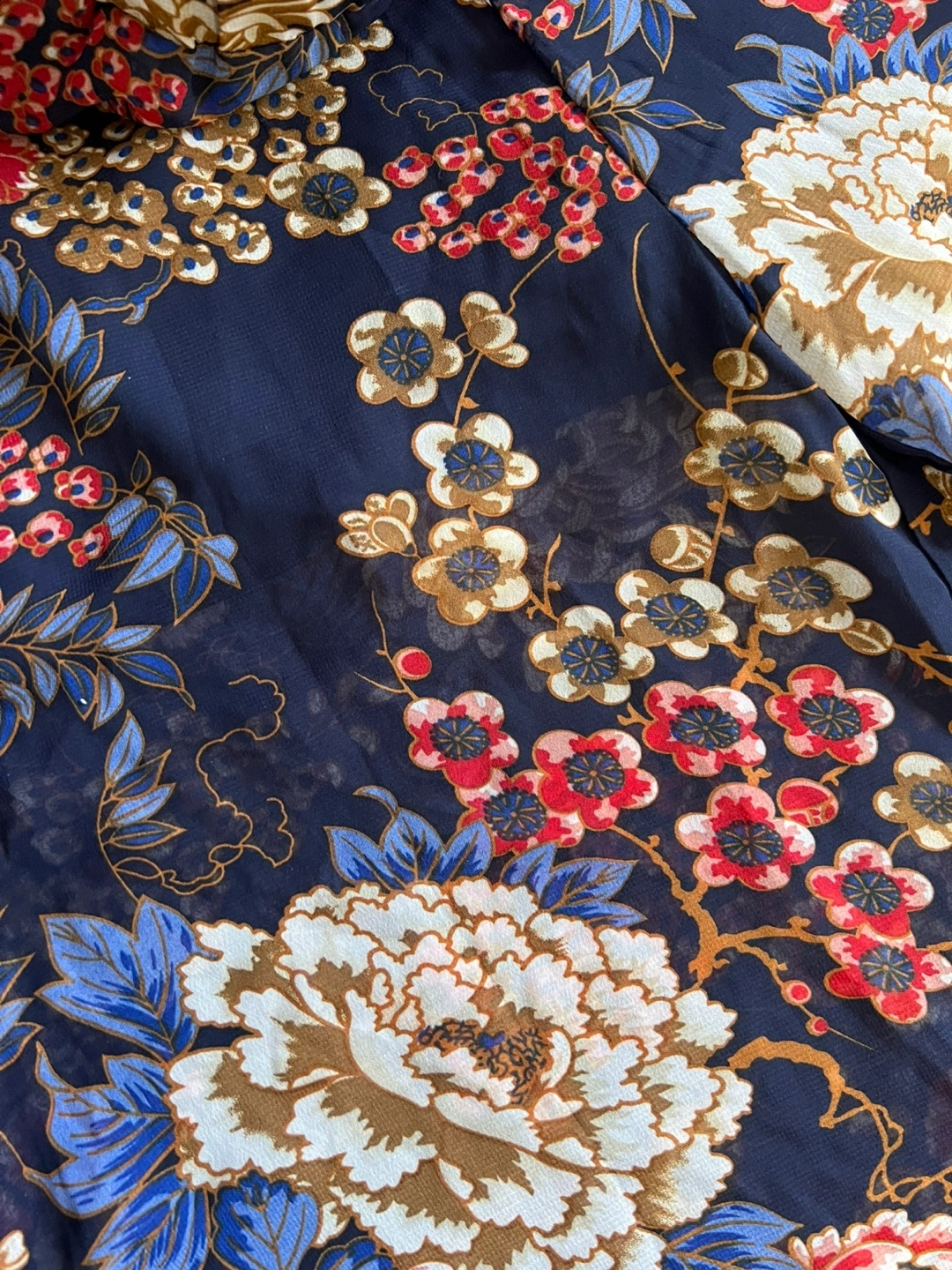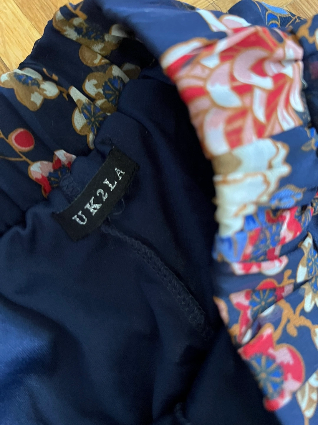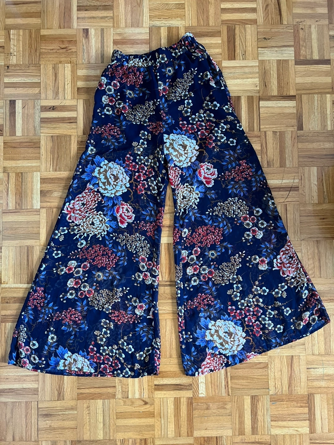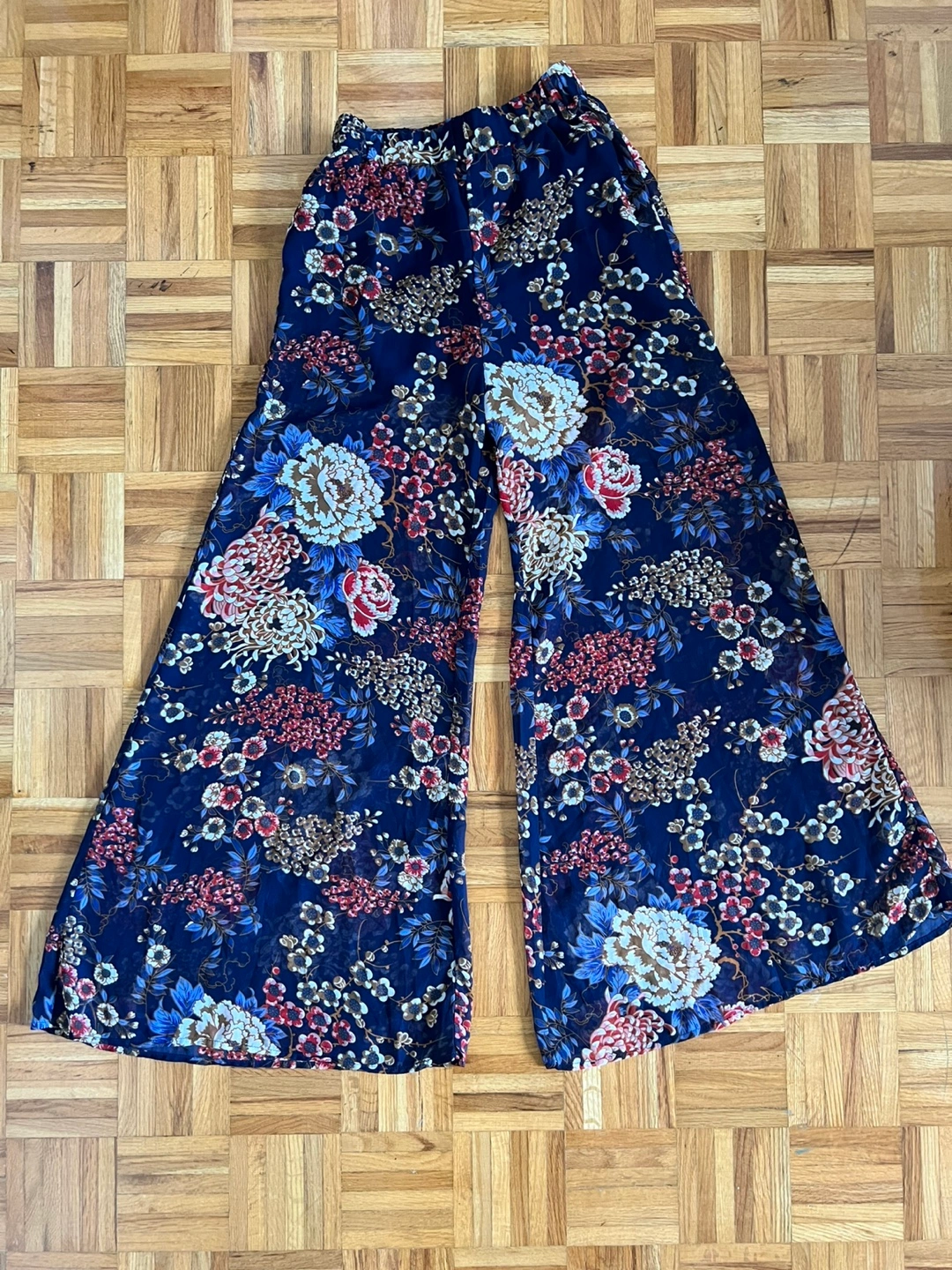 These are a pair of floral print wide leg pants from UK2LA. They feature a beautiful floral pattern in shades of blue, red, and white. Perfect for adding a pop of colour to your wardrobe!