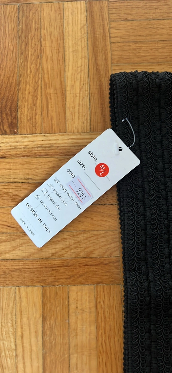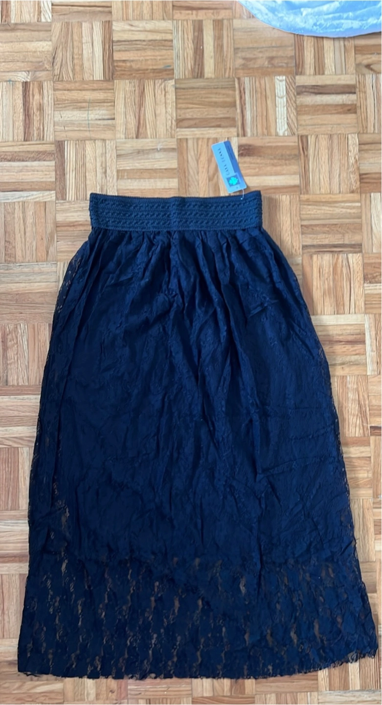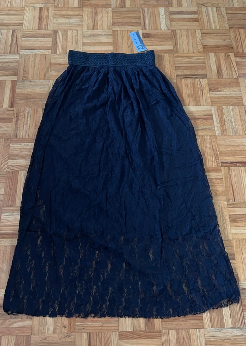 This is a beautiful black lace skirt from Casa Donna. It's a size medium and is made in Italy. The tag indicates it should be washed in warm water, medium iron, and not be tumble dried. It's in great condition!