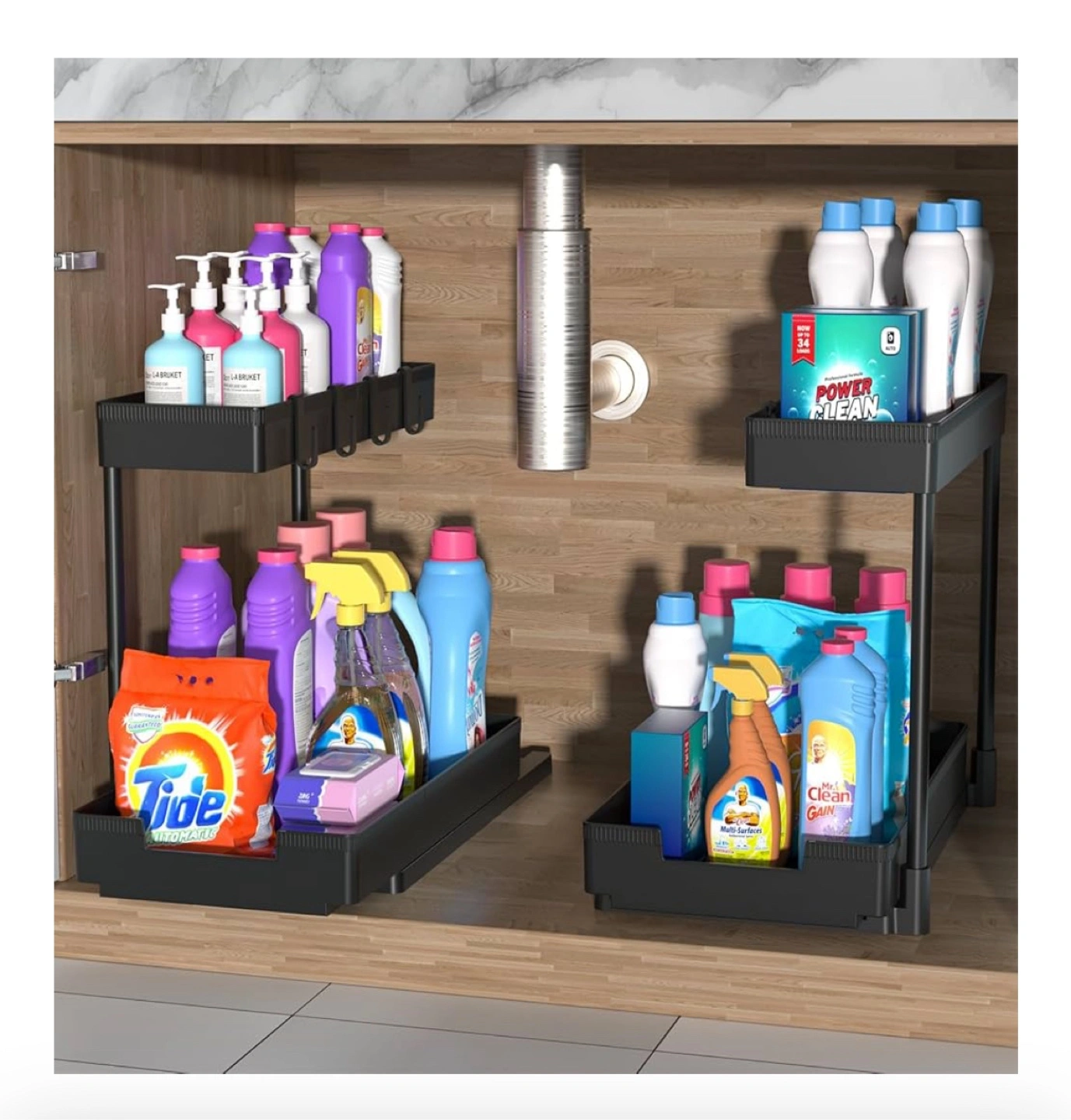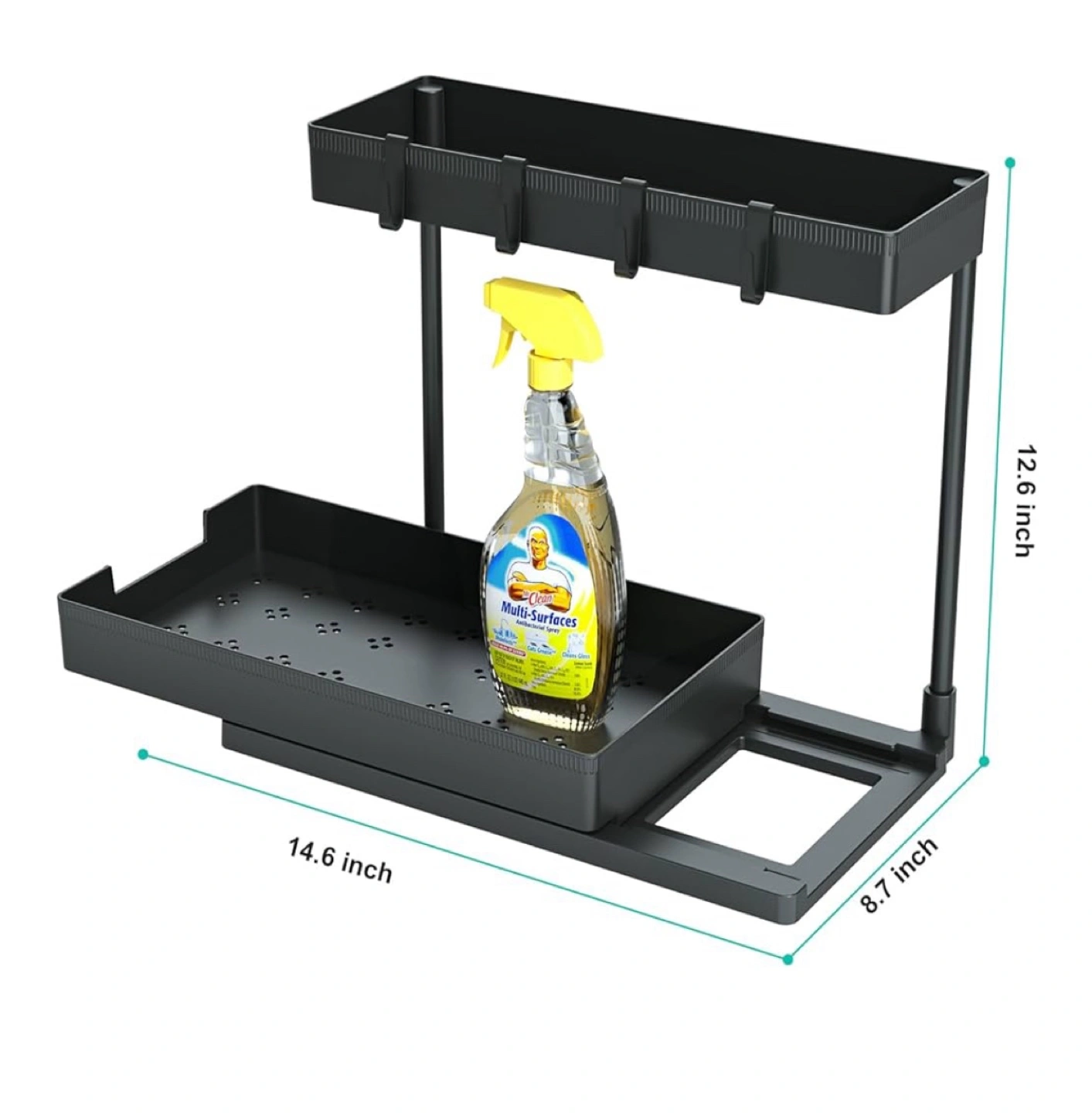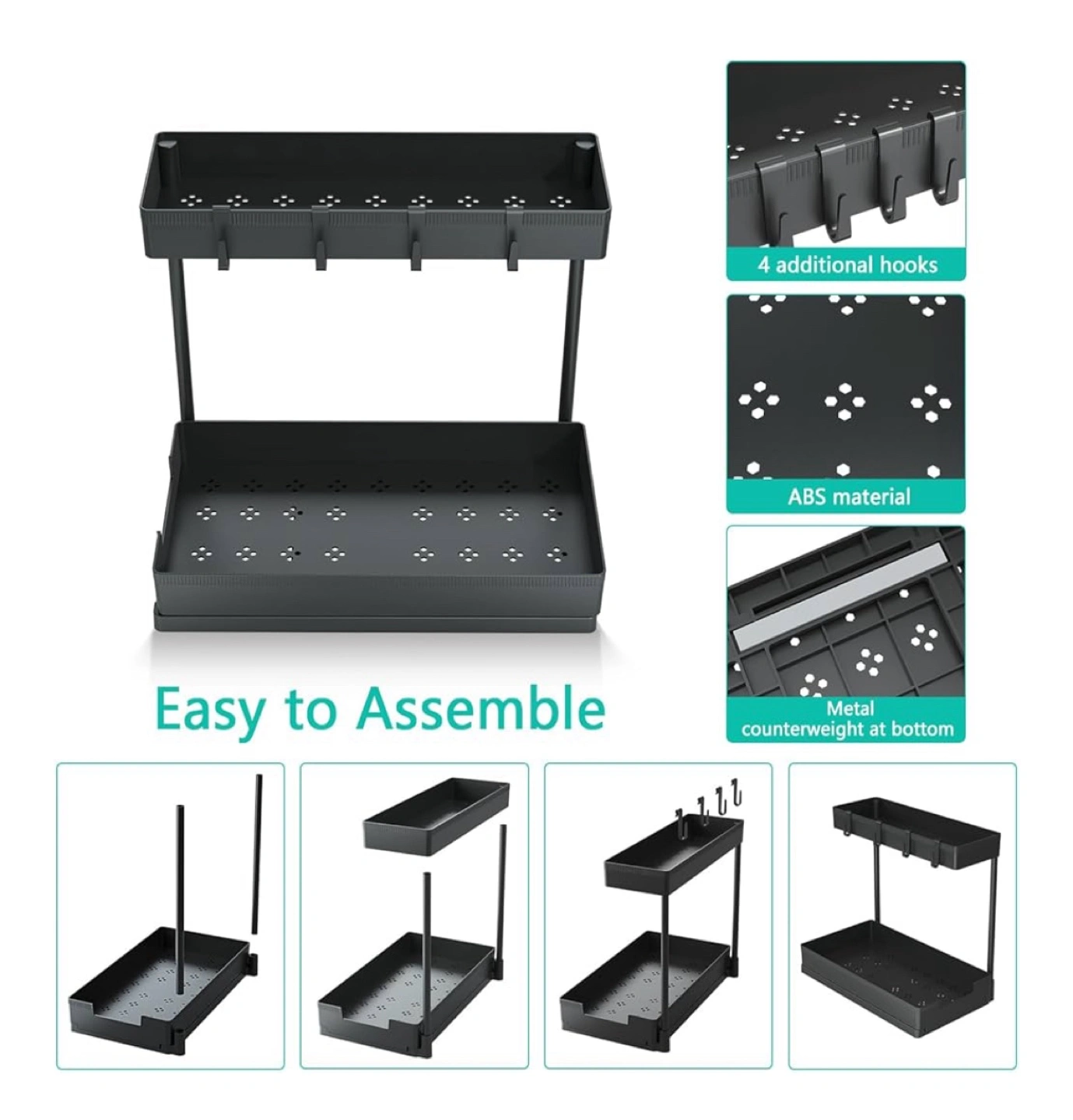 I have an under-sink organizer for sale! It comes with a sliding storage drawer, making it super convenient. It also has 4 additional hooks and is made of durable ABS material. The organizer includes a metal counterweight at the bottom, and it's easy to assemble! Perfect for keeping your cleaning supplies tidy under the sink