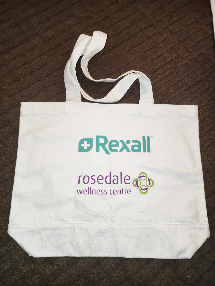 I have a reusable tote bag featuring the logos of Rexall and Intrepid Health. It's perfect for groceries, books, or anything else you need to carry. It's in brand new condition and ready for a new home!