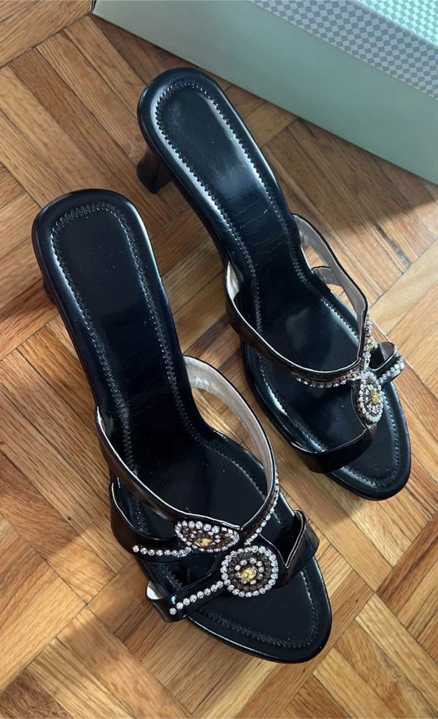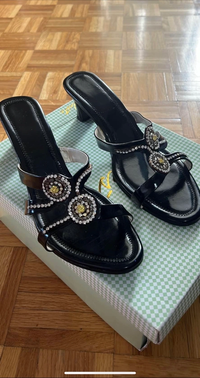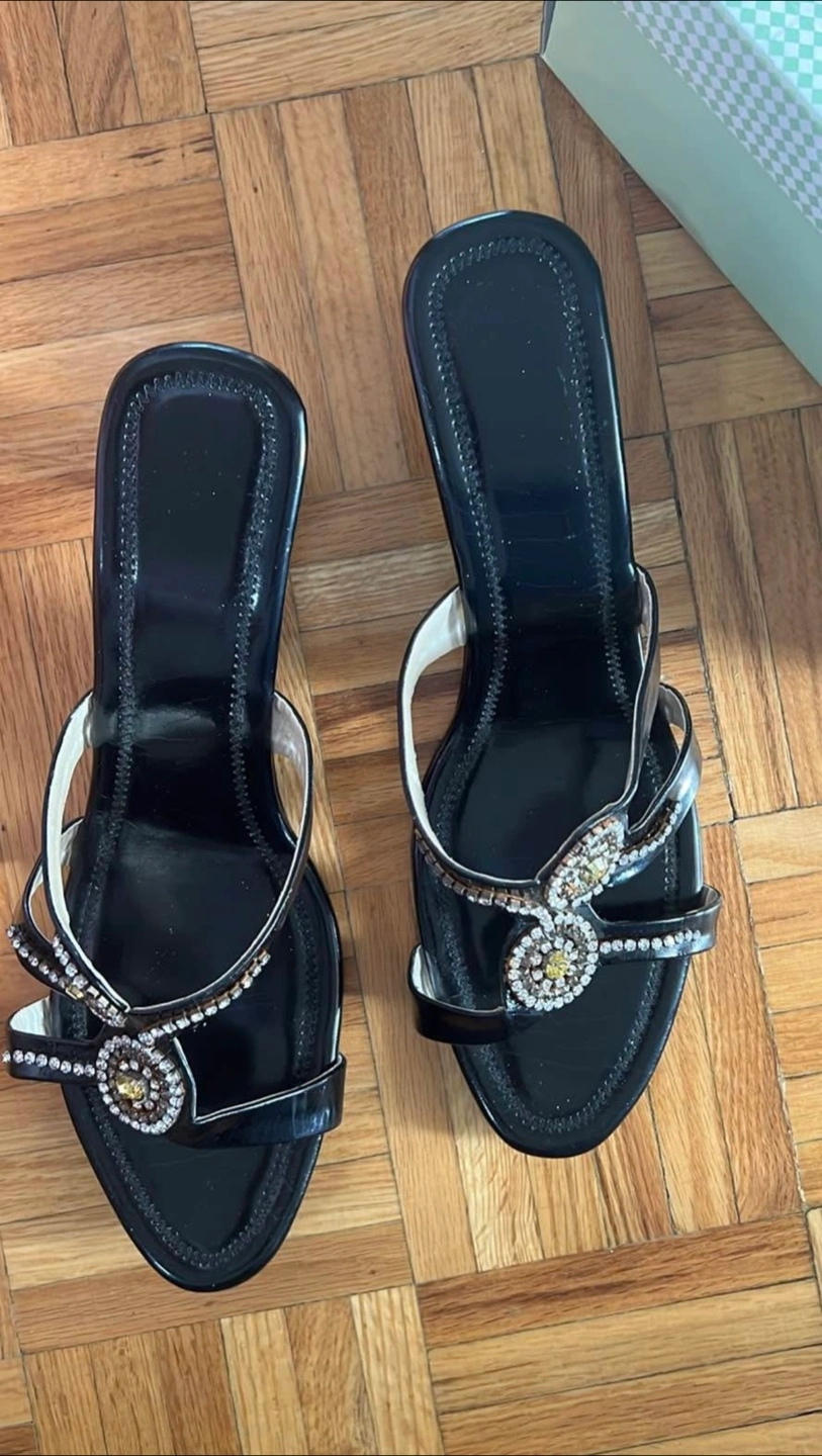 Selling a pair of Stacy heeled sandals in black. These stylish sandals are a size 12 and come with their original box. They feature a unique design with decorative embellishments. Perfect for adding a touch of elegance to any outfit!