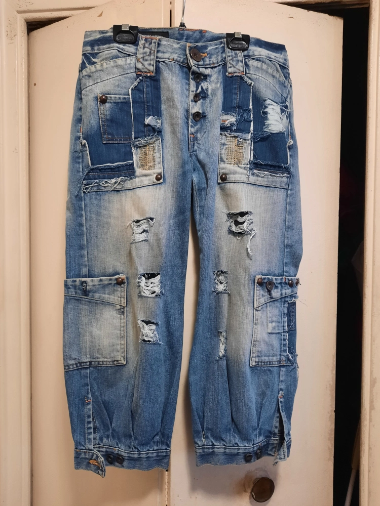 Unique denim capris with a distressed patchwork design! These have a cool, vintage vibe with lots of interesting details. Perfect for adding some edge to your wardrobe