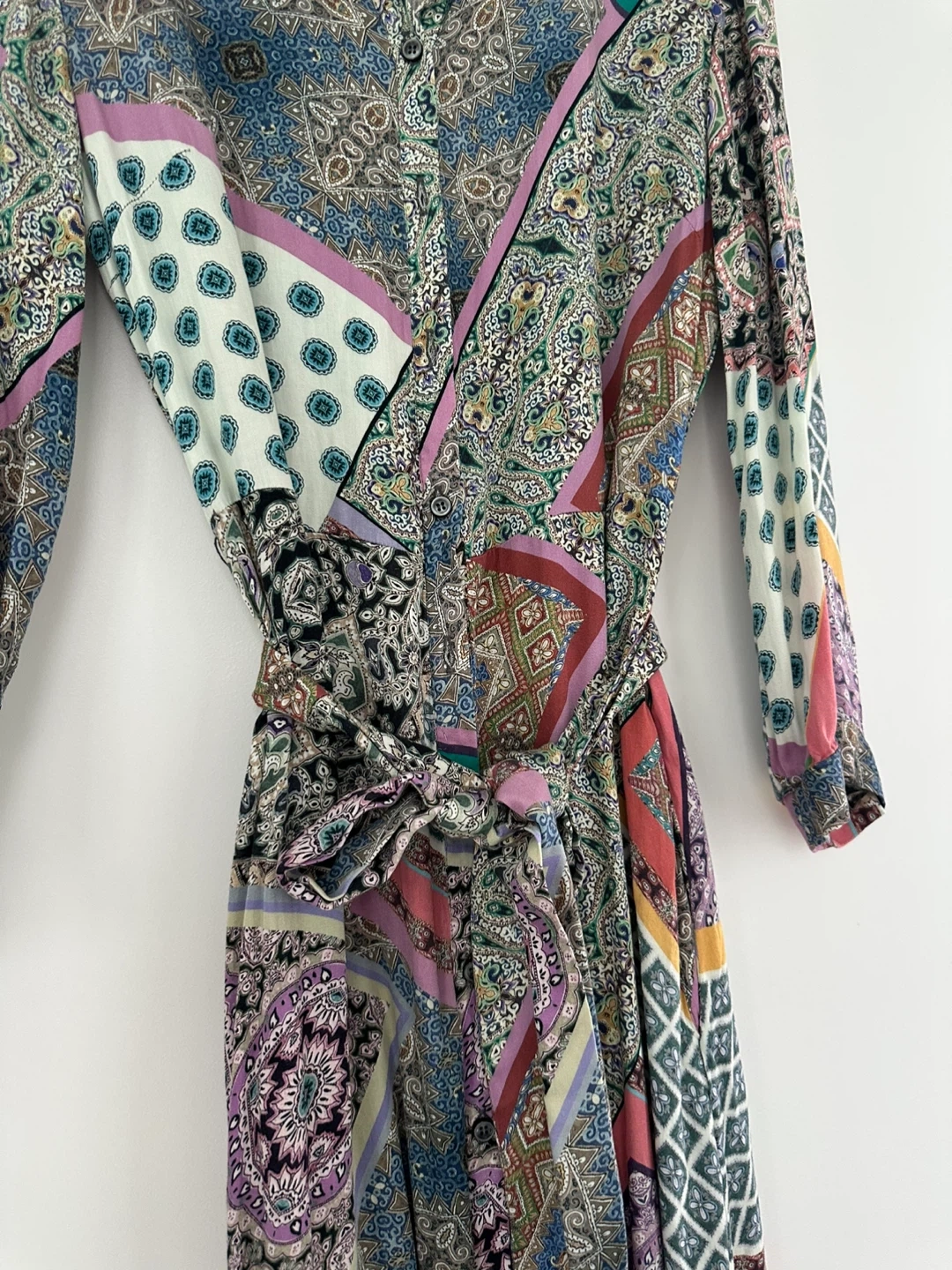 This is a long sleeve dress with a colourful patterned design. It features a button-up front and a tie at the waist. It's in great condition and ready for a new home!