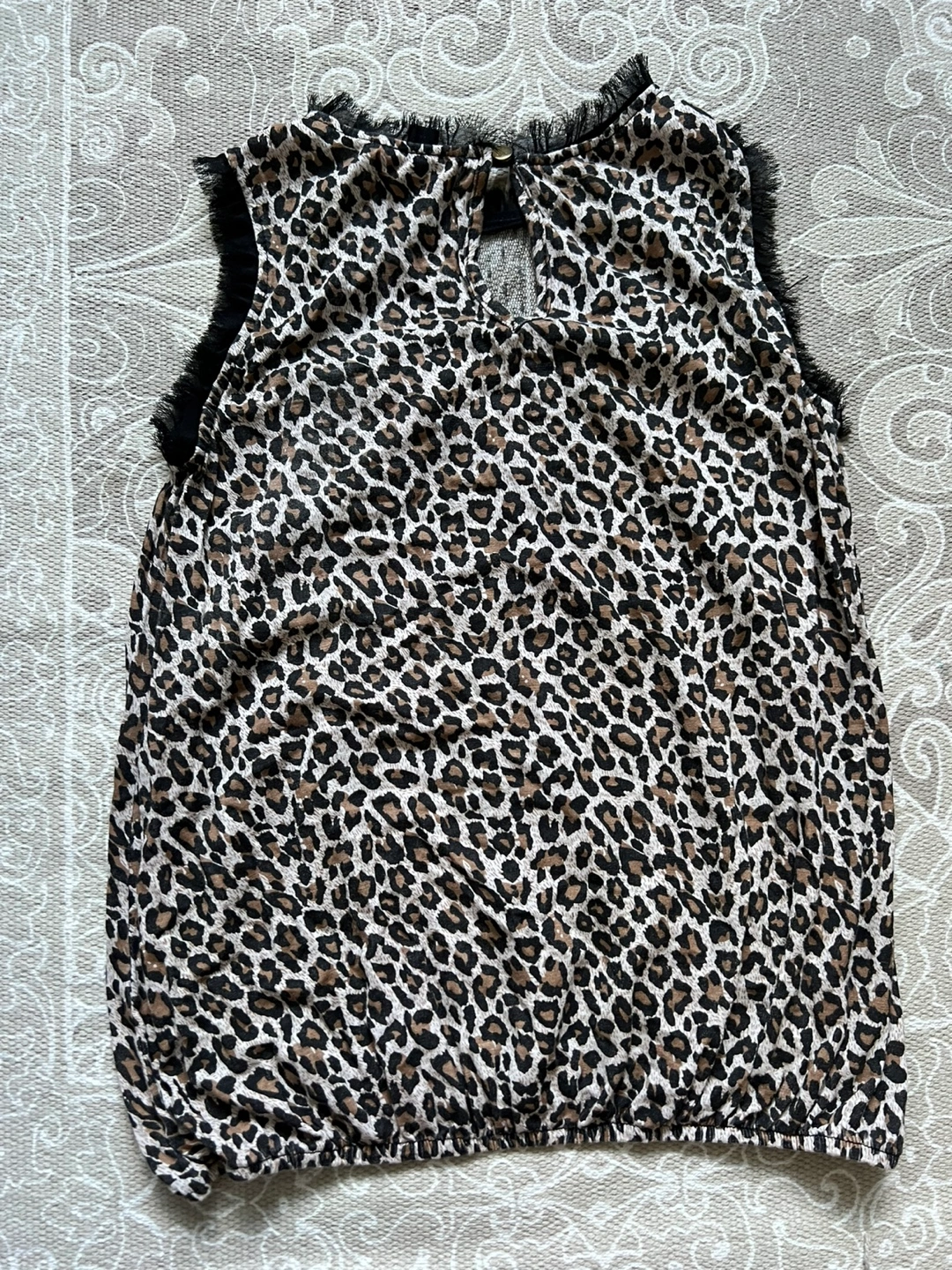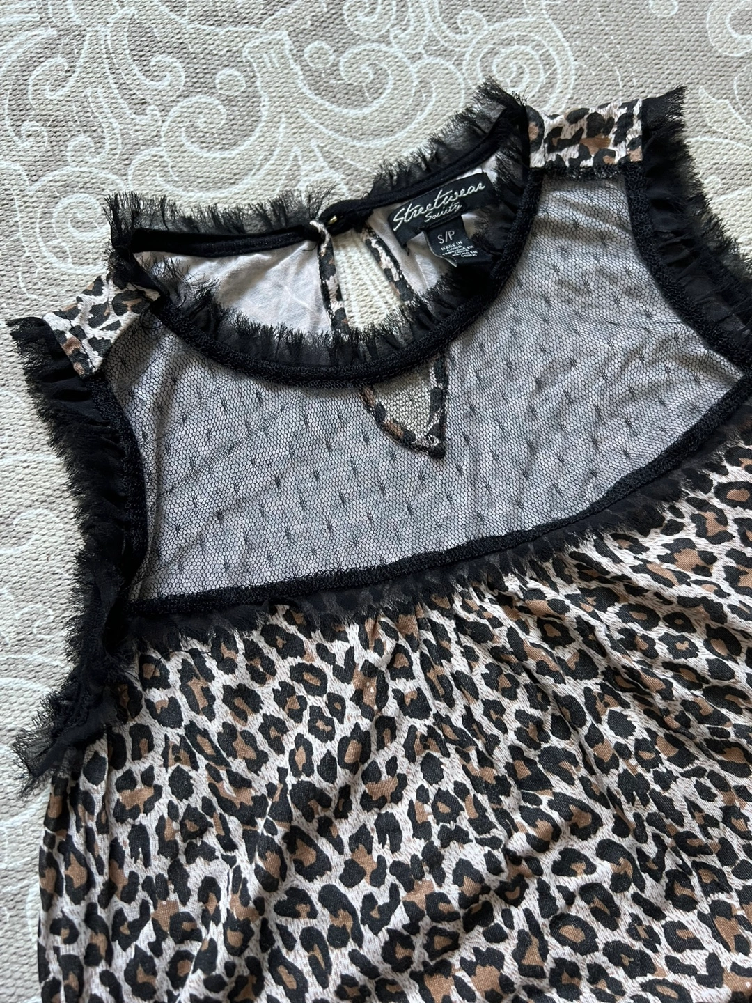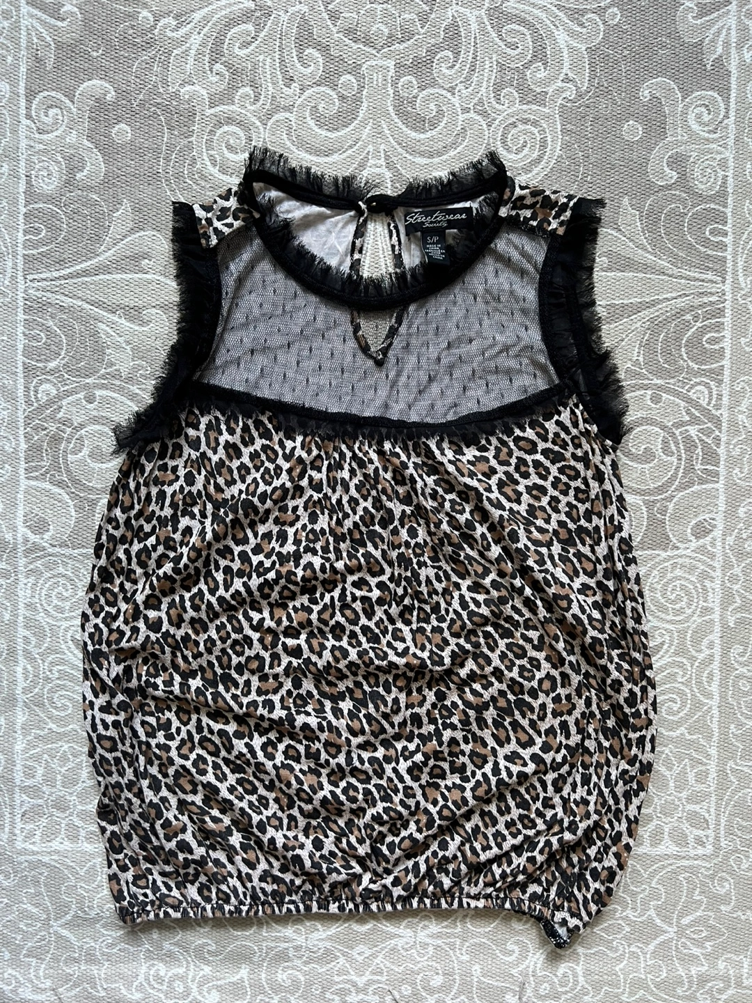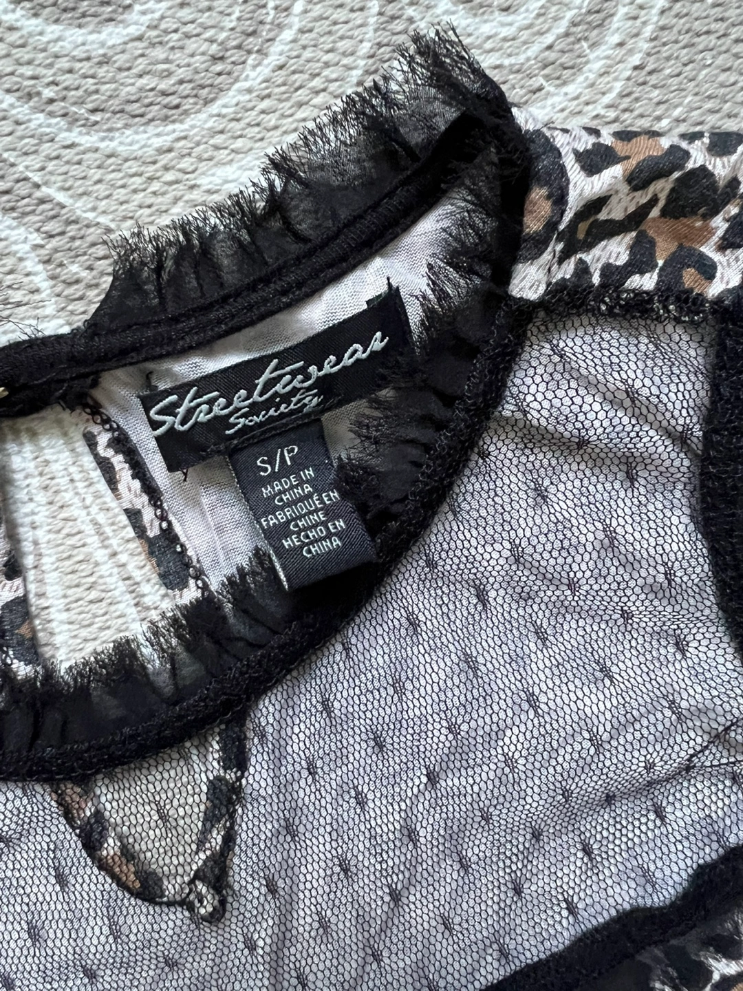 Cute Streetwear Society top in a fun leopard print! It's a size S/P and features a sheer, dotted mesh panel at the top with black fringe detailing. Perfect for adding a bit of edge to your wardrobe!